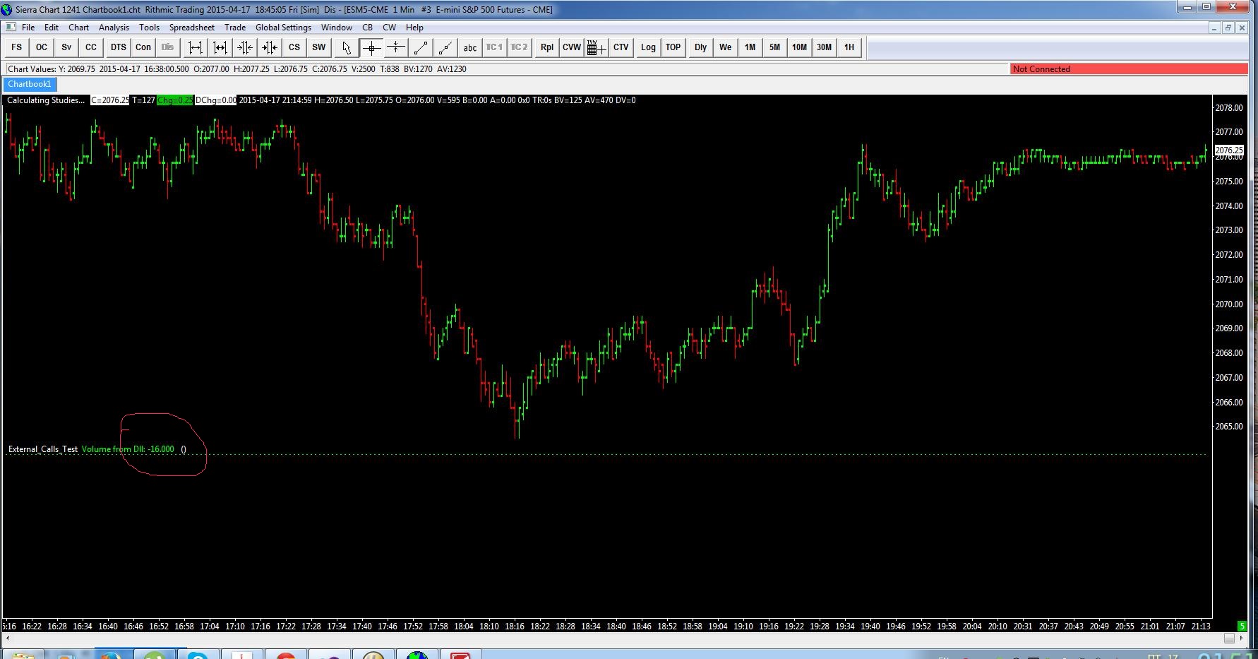 zaza - Here is a sample code you can use for this. typedef int (__cdecl *SETINT)(int); typedef int (__cdecl *GETINT)(void); HINSTANCE hinstLib = LoadLibrary(TEXT("F:\\temp\\M_GV_d.dll")); SETINT SetInt = (SETINT) GetProcAddress(hinstLib, "GV_SetInteger"); GETINT GetInt = (GETINT) GetProcAddress(hinstLib, "GV_GetInteger"); SCSFExport scsf_ExternalCallTest(SCStudyInterfaceRef sc) { SCSubgraphRef Volume = sc.Subgraph[0]; if (sc.SetDefaults) { sc.GraphName = "ExternalCallTest"; sc.StudyDescription = "ExternalCallTest."; sc.AutoLoop = 1; Volume.Name = "Volume from Dll"; Volume.DrawStyle = DRAWSTYLE_BAR; Volume.LineWidth = 2; Volume.PrimaryColor = RGB(0, 255, 0); sc.FreeDLL = FREEDLL; return; } if (sc.LastCallToFunction) { FreeLibrary(hinstLib); return; } SetInt((int)sc.Volume[sc.Index]); Volume[sc.Index] = GetInt(); return; } http://www.sierrachart.com/image.php?l=1429469107752.png Date Time Of Last Edit: 2015-04-19 19:16:47