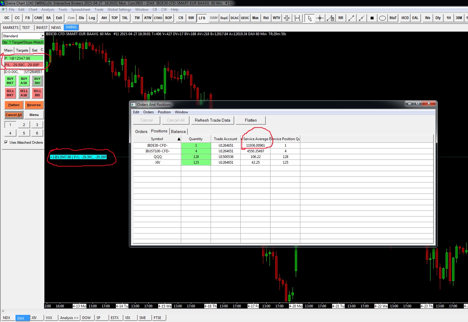 Dear support team, My SC doesn't show the correct entry level for a trade in DAX (CFD with IB) on the chart, however it shows the correct data in "positions and orders tab". Instead it uses the entry data of an old trade which I entered two weeks ago, but is long closed already. I sometimes open orders not on SC, but also on mobile TWS. I tried everything already that is described in http://www.sierrachart.com/index.php?page=doc/doc_TradeStatusWindows.html#IncorrectlyReportedTradePosition What can I do that the chart (attached chart trader and opening line) shows the correct entry position? Thank you SC shows incorrect data of |