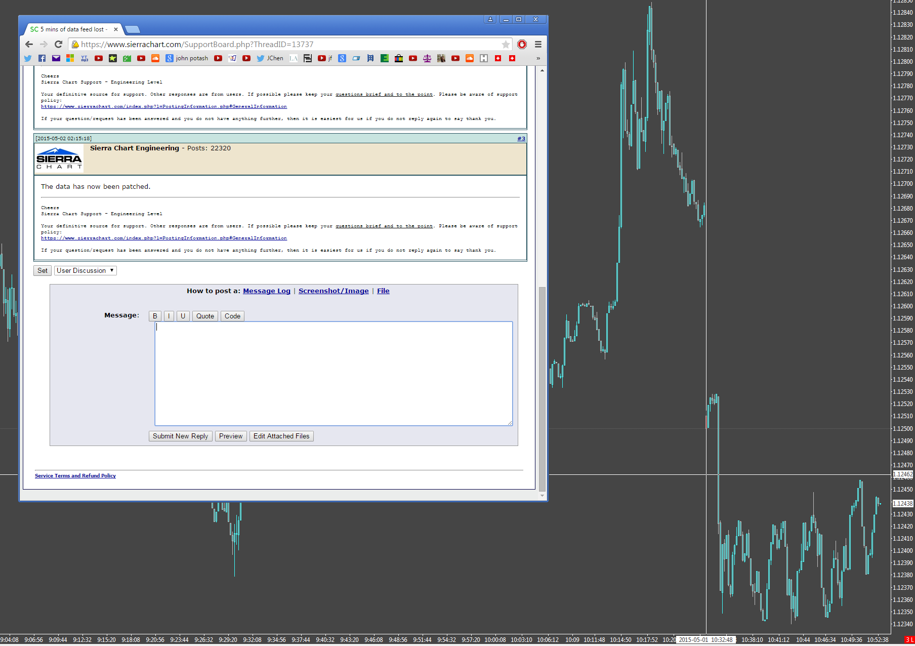 http://www.sierrachart.com/image.php?l=1430475262249.png This is peak time FX... 10am London session.. why on earth is there this much price data intermittently missing, for absolutely no reason? This is infuriating http://www.sierrachart.com/image.php?l=1430475422375.png |