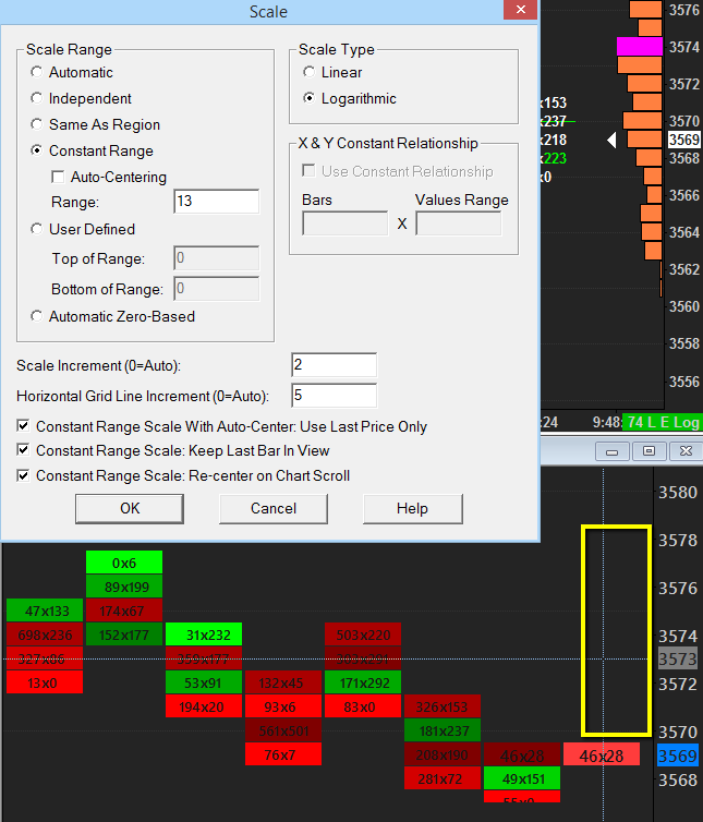 In the case I changed back to Interactive Scale Range and Scale Range: Automatic. The scale automatic moving when last price nearly reach the bottom, which is good. However, it doesn't work when it goes to upside, I still can't see the last price, it goes up beyond and I have to move up manually or reset to see. Also when I using these setting, the scale range is changed automatically make the number bar harder to see. I try every setting and reset but there is nothing work except auto center which I am not prefer to use it to read number bar. If you were trading, it would not be a ideal if you need to reset the scale range every 5 minute for each number bar charts or even more frequently when market moving fast or high volatility. This would be really annoying. Would it be ok if SC team adjust the scale setting to Automatic Range-based scaling? The full range is 6 points but the range base scaling is only 4 points count from center, if price move up 4 point then the full range automatically scaling up, not wait until 6 point in current version. Thank you Date Time Of Last Edit: 2015-05-06 00:32:06