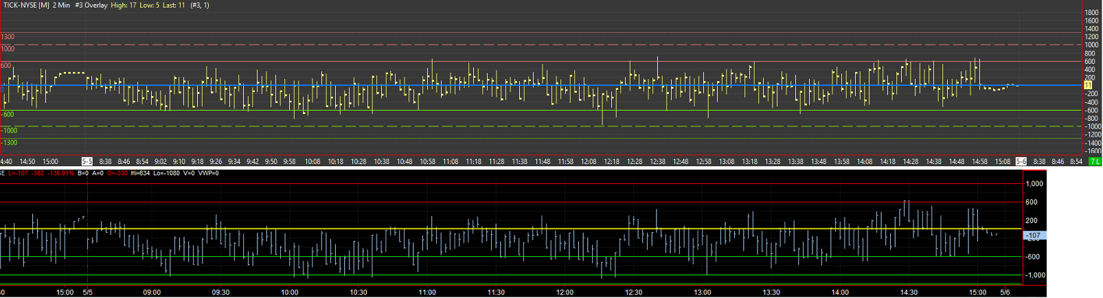 SCH team, are there any updates on NYSE-TICK development? You said you have to experiment with ignoring thinly stocks. There are still significant distinctions especially on bearish days like yesterday in ESM5 contract. We see higher values above 0 than below 0, while there is much more pressure from sellers than buyers, seen via price action and other providers of TICK showing -600/-700 values while in Sierra chart, TICK does not reach even -600. It is longterm issue with SCH TICK and it has biggest impact when markets are bearish, it is tough to recognize it due lack of momentum on TICK. Traders who rely their view on TICK are often misled. Thanks for your effort in dealing with this. |