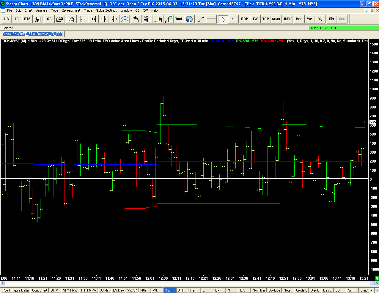 Hello, You guys may want to try using the TPO Value Area Lines on the NYSE-TICK instead of fixed numbers. The value area high and low self adjusts to market volatility so extremes are easier to spot. I've used this for over a year now and it provides a better perspective. --WT |