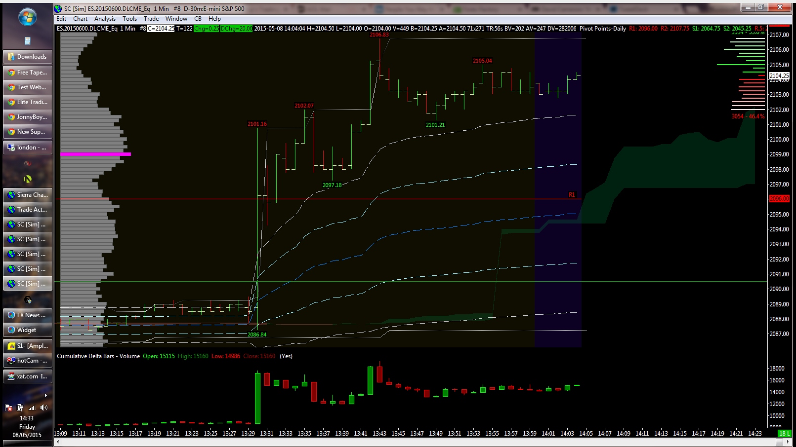 Hello, I've got a demo account data connection with CTS, all other products seems to be working ok but the ES charts are following 30mins behind, it's like watching replay. From the attached screenshot you can see my system time is 14:33 but the chart last print is 14:04, even the DOM graph is active and working. Any idea how to fix this problem? thanks. |
