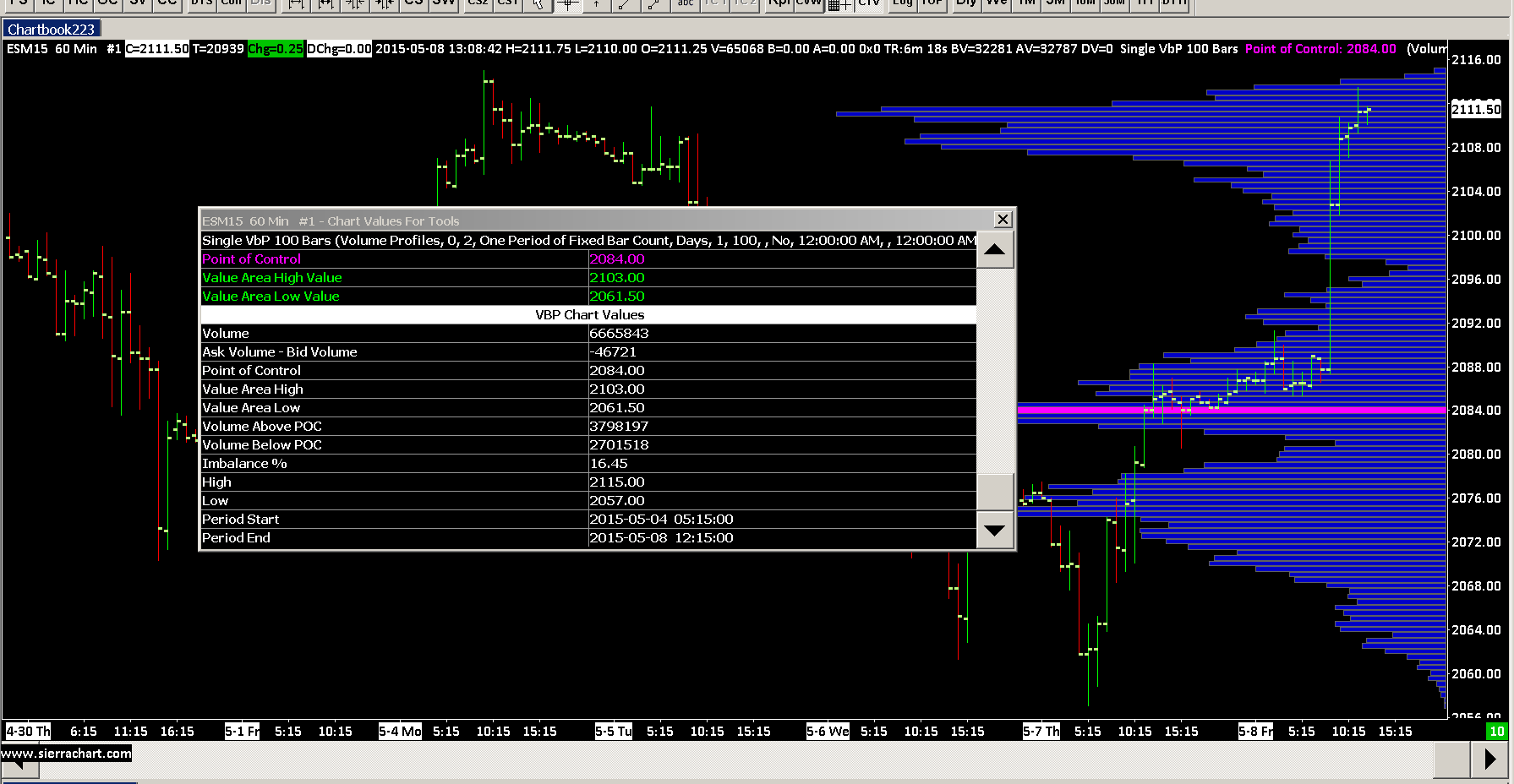 You can do what you want. Here is a screenshot of the chart and of the Tool Values window which shows the relevant Input settings of the Volume by Price study configured the way you need: http://www.sierrachart.com/image.php?l=1431205390298.png You can programmatically access the point of control using the point of control Subgraph, sc.Subgraph[1], from the Volume by Price study. Sierra Chart Support - Engineering Level Your definitive source for support. Other responses are from users. Try to keep your questions brief and to the point. Be aware of support policy: https://www.sierrachart.com/index.php?l=PostingInformation.php#GeneralInformation For the most reliable, advanced, and zero cost futures order routing, *change* to the Teton service: Sierra Chart Teton Futures Order Routing Date Time Of Last Edit: 2015-05-09 21:04:41
