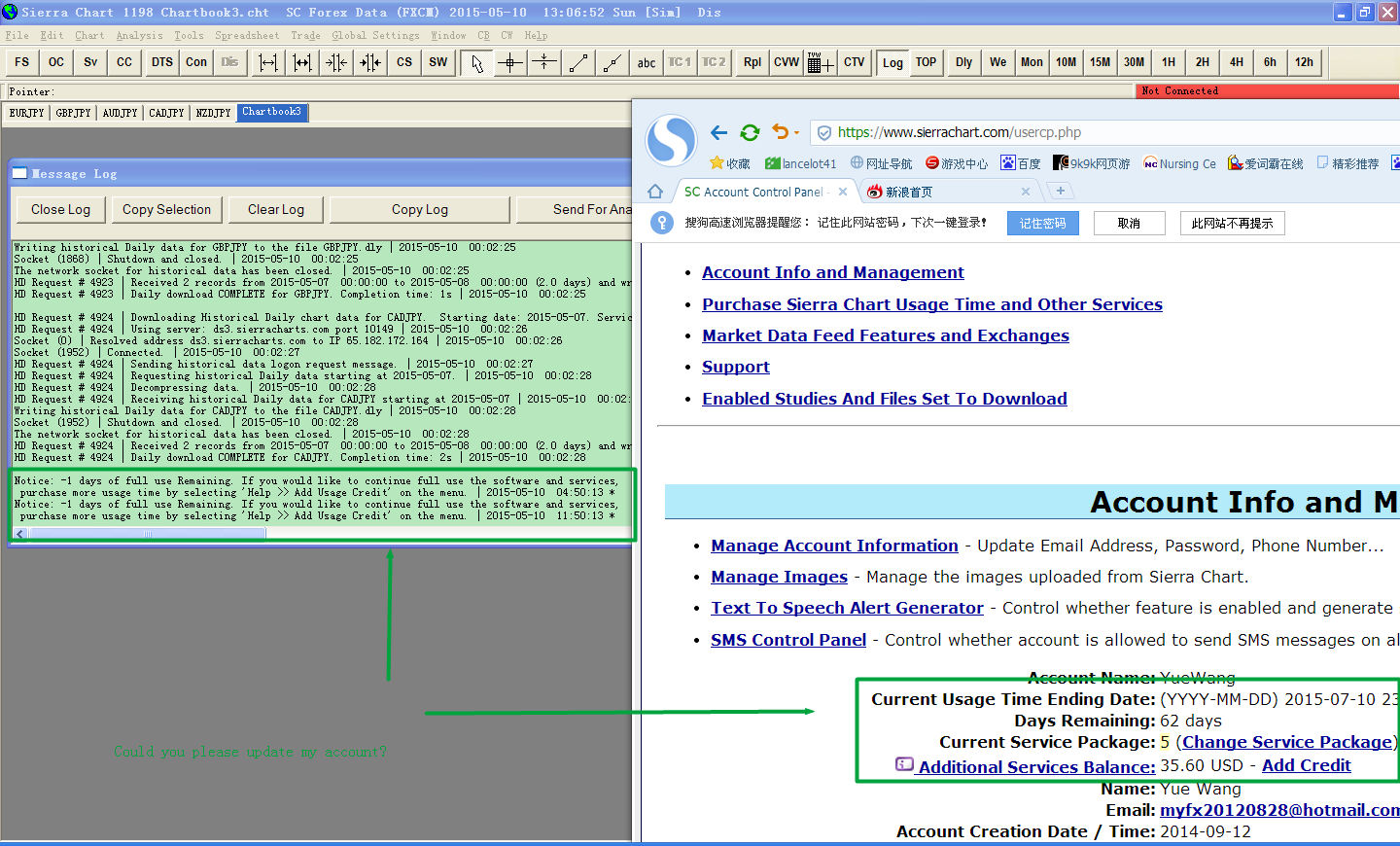 Hi, My sierrachart shows -1 days of full use remaining and can not connect to the server. But my account seems have 62 days remaining. Could you please help me to update my account? Thank you! Best Regards! YueWang |