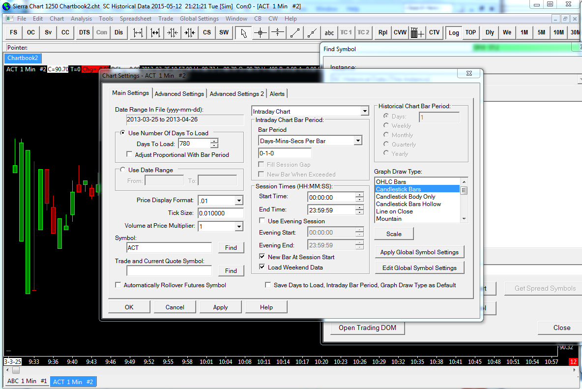 I'm trying to display 2 years of intraday data on chart and download using the Write Bar To File study. It displays and downloads data only from 3/25/2013 to 4/16/2013, even though i specified "Number of Days to Download = 780" in the Chart Settings. Attached is data from ACT-BarData.txt file and a screenshot showing Chart Setting. How do i get it to display and download the entire 2 years from 5/1/2013 - 5/1/2015? thanks Kiran |