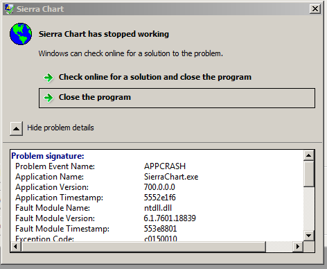 At this point we do not know the reason for the problem. We are somewhat suspicious that this problem is a Windows issue but this is not clear at this point. We recommend just using Sierra Chart in a different folder for now. Here are instructions to move the files over: Http://www.sierrachart.com/index.php?page=doc/helpdetails15.html This is the first report a problem like this when there are no DLL files in the Data folder. We will have to see if there are others. Sierra Chart Support - Engineering Level Your definitive source for support. Other responses are from users. Try to keep your questions brief and to the point. Be aware of support policy: https://www.sierrachart.com/index.php?l=PostingInformation.php#GeneralInformation For the most reliable, advanced, and zero cost futures order routing, *change* to the Teton service: Sierra Chart Teton Futures Order Routing |