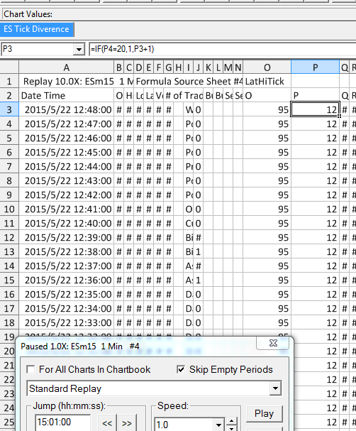 Hello; I am using SC spreadsheet for trading. I'm using version 1258. In the old spreadsheets. This is on a one minute chart. In cell p3, this formula =IF(P4=20,1,P3+1), I would have expected to count on each new row of data, instead, it updates it seems every time the data changes on the chart. 10-20 times per minute. Another issue is that in the following columns, I don't see a counting on each row, but a repeat of the same number that changes in cell p3, again 10-20 times per minute. |