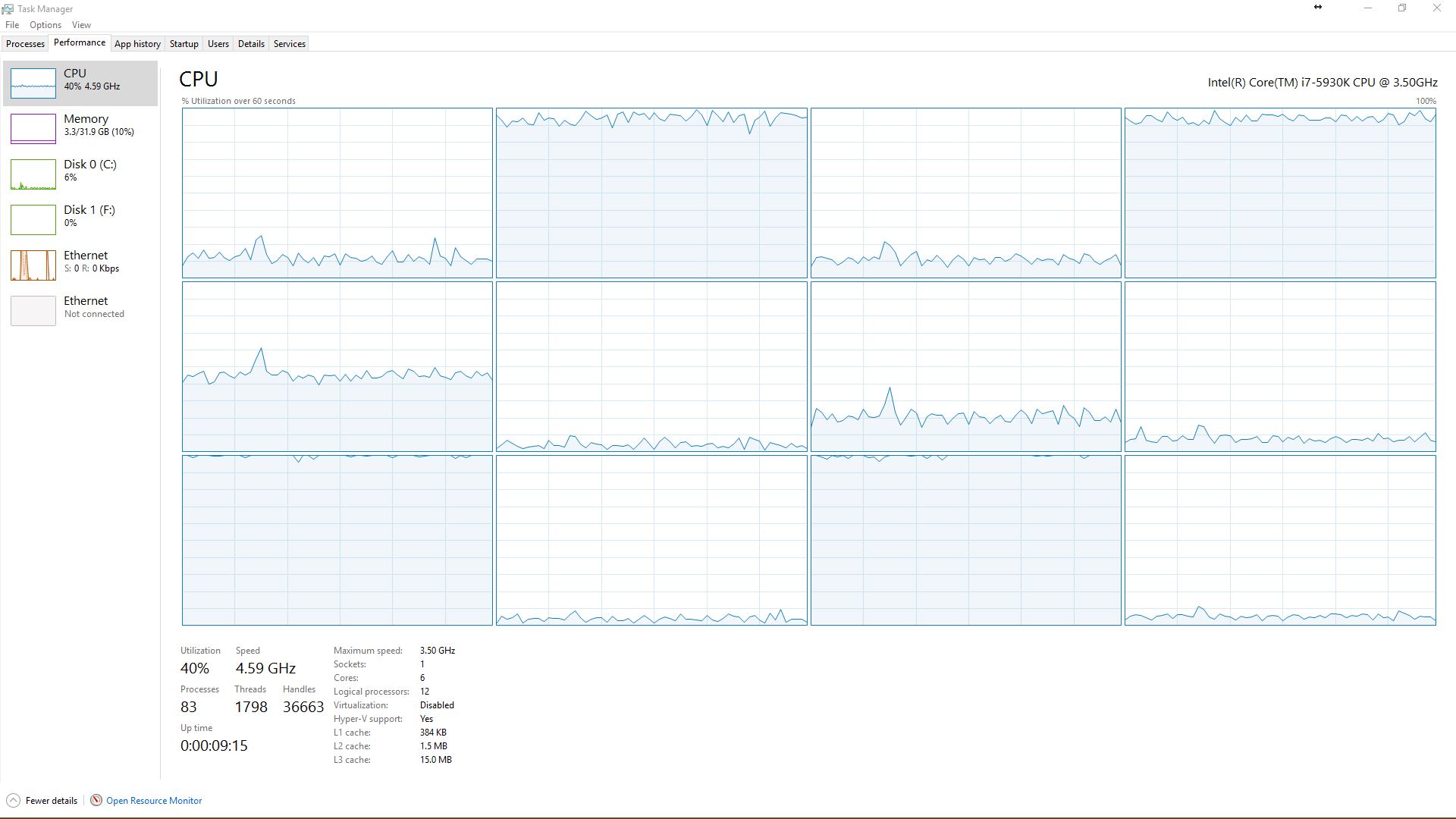 Hi all, Since I commented earlier and I was looking to upgrade my trading computer, I thought I can put in my 2 cents now - as I just replaced my old (Intel Core 2 Quad Q6700 based) trading computer with a new computer. Key specifications are as follows: CPU: Intel Core i7-5930K 3.5GHz overclocked to 4.6GHz Cooling: Corsair H100i GTX liquid CPU cooler RAM: 32GB of DDR4-2133 SSD: Samsung 850 EVO 1 TB Sierra Chart instances: 4 instances are loaded together with an IB trading platform (I am using the 1392 pre-release version of Sierra Chart) Takeaway: 1. The overclocking helps a little and noticeably slightly faster chart loading vs. no overclocking. 2. In an ideal condition, with an ambient temperature about 21°C and with some tweaking of the fan speed profiles, etc., the CPU would briefly spikes up to about 75°C and then settles down at around 61°C. 3. As per the attached screen shot of CPU loading at "launch" of all 4 instances, all 6 cores (the other 6 cores are virtual cores - which is why there are 12 charts) are max out for about a minute while the charts loads (chart is of 1 minute interval). 4. As per the attached screen shot of CPU loading when "running" normally of all 4 instances, 2 cores were almost at zero load, 1 core at about 15-20% load (browser?), 1 core at 50% (probably IB platform?), and finally 2 cores at close to max out at 100%. Comment for Sierra Chart engineering: If you are ever going to make Sierra Chart work with multiple cores, please spread out the loading a bit if you can so the cores operating are not constantly maxed out at close to 100%. Just a thought and not a requirement. |