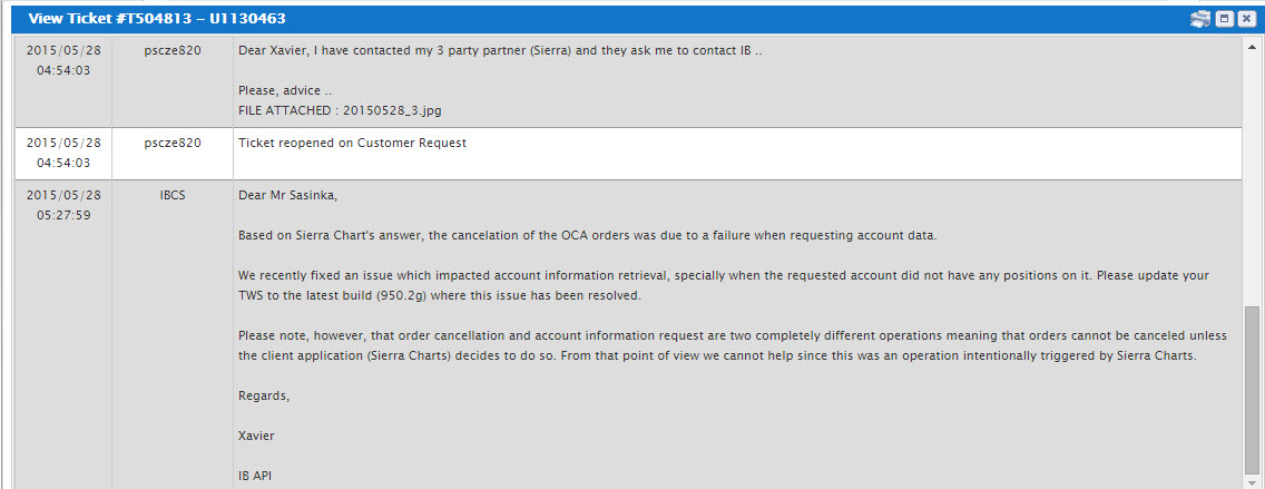 IB wrote, that "Our records show that you were submitting a parent order with two children attached to it. Aftre the parrent order was filled, the children became active as it usually happens but a cancelation was requested for one of them. This caused the other child order“s cancelation as part of theOCA mechanism". This is the truth. The point is that I cancelled the child because my parent order disapeared on Sierra platform (I was extremely nervous, on Sierra I saw two children orders and the trade disapeared. SO, I planned to decrease the problem.) Please, advice .. |