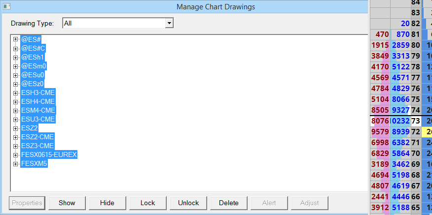On Manage Chart Drawings Window, you select the top one then shift to the bottom, then click delete, this is for all charts of chart book