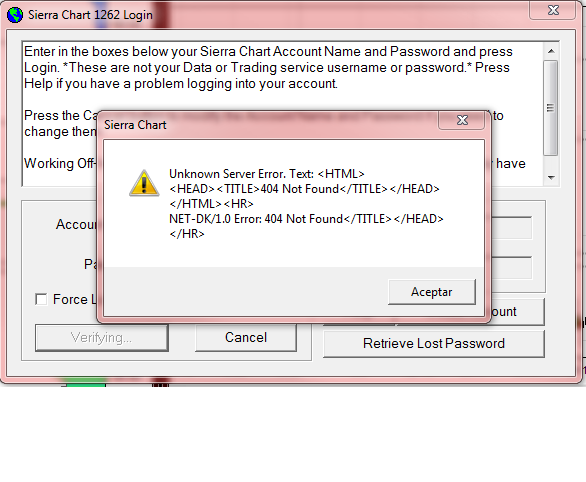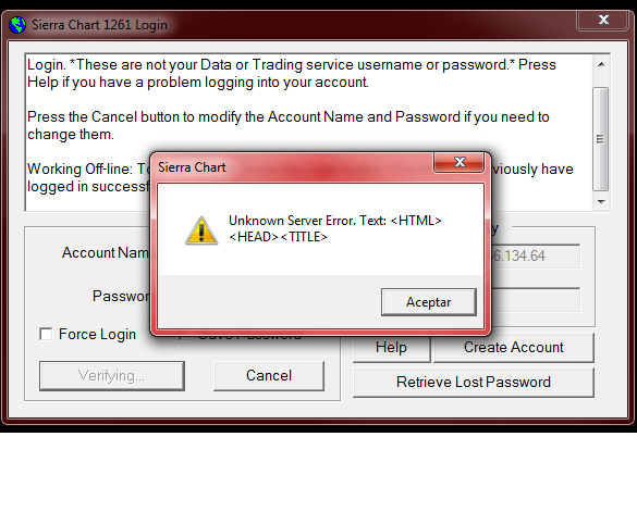 Show your ISP the HTML text after "Unknown server error. Text:". See if they recognize it. Our only advice is to use a different ISP. This is some problem on your side with the ISP. Sierra Chart Support - Engineering Level Your definitive source for support. Other responses are from users. Try to keep your questions brief and to the point. Be aware of support policy: https://www.sierrachart.com/index.php?l=PostingInformation.php#GeneralInformation For the most reliable, advanced, and zero cost futures order routing, *change* to the Teton service: Sierra Chart Teton Futures Order Routing |
