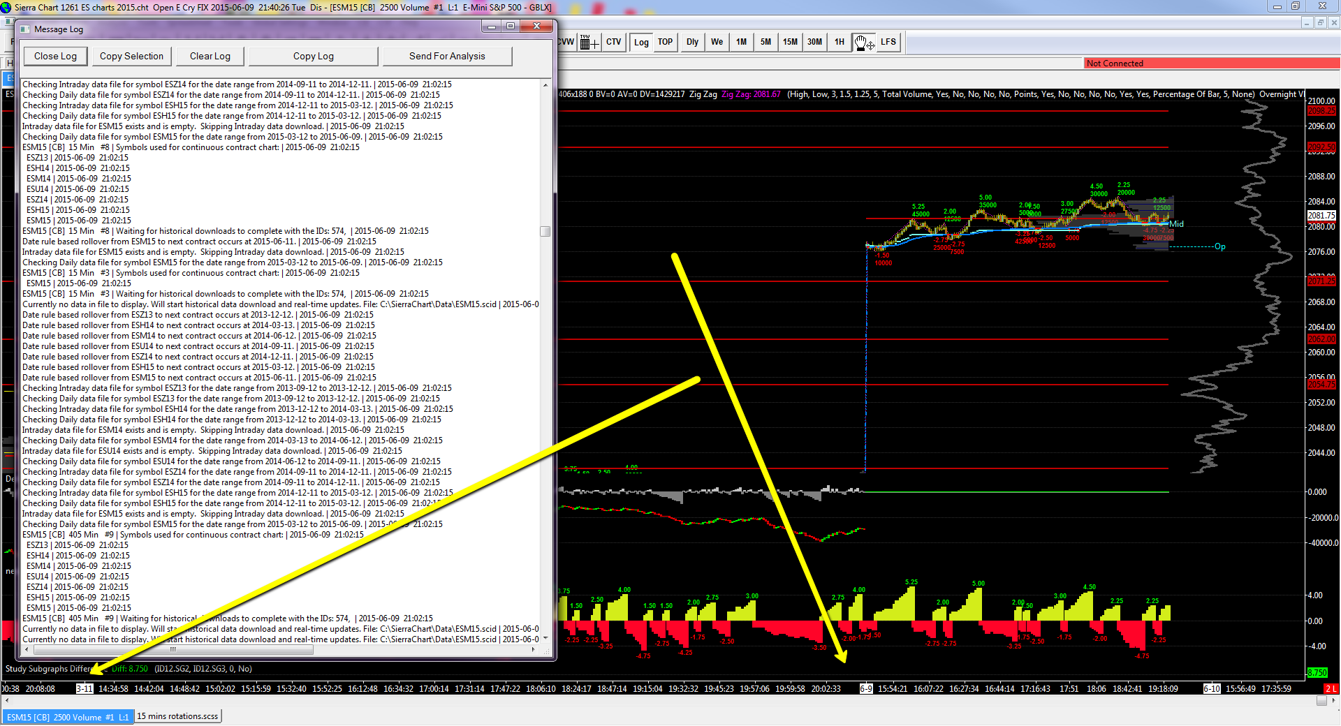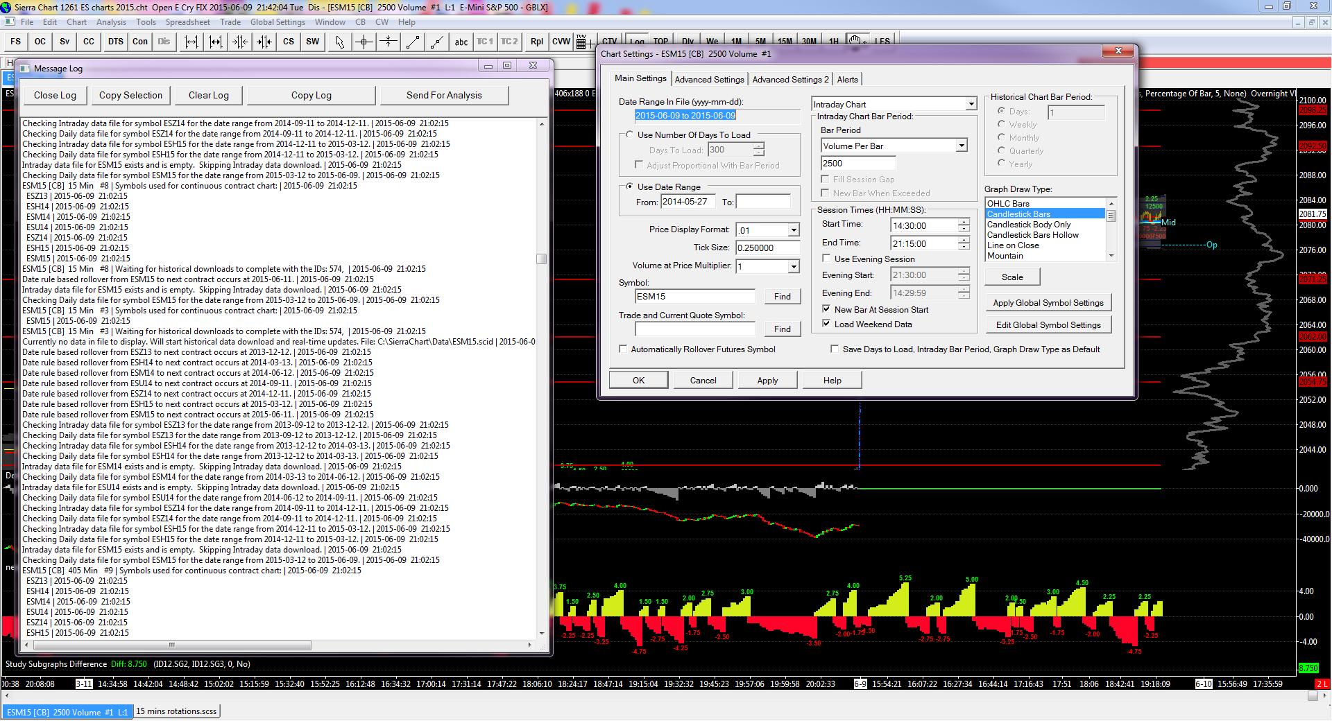 Thanks a lot for your assistance. I have my charts up as they should. But now, as far as I understand it there is a problem with my charts tagging each other continuously - please see log. Will this be something in my study settings within these charts, do you think? -- Open E Cry FIX | Connected to the market data server. | 2015-06-11 03:57:47 Open E Cry FIX | Connected. | 2015-06-11 03:57:47 Open E Cry FIX | Starting real-time market data updates for: ESM5. ID: 1 | 2015-06-11 03:57:48 Intraday data recording state for symbol ESM5 is set to download pending. | 2015-06-11 03:57:48 HD Request # 224 | Downloading Intraday chart data for ESM5 to the file ESM5.scid. Service: oec | 2015-06-11 03:57:48 HD Request # 224 | Download start Date-Time: 2015-06-11 03:56:34.0 | 2015-06-11 03:57:48 HD Request # 224 | Using server: oec.sierracharts.com port 10149 | 2015-06-11 03:57:48 Socket (0) | Resolved address oec.sierracharts.com to IP 204.11.49.26 | 2015-06-11 03:57:48 Socket (588) | Connected. | 2015-06-11 03:57:48 HD Request # 224 | Sending historical data logon request message. | 2015-06-11 03:57:48 HD Request # 224 | Requesting Intraday data. Start Date-Time: 2015-06-11 03:56:34. Record interval: 0. Symbol: ESM5 | 2015-06-11 03:57:48 HD Request # 224 | Decompressing data. | 2015-06-11 03:57:48 HD Request # 224 | Receiving Intraday data for ESM5 starting at 2015-06-11 03:56:34 | 2015-06-11 03:57:48 HD Request # 224 | Timestamp of first Intraday data file record written: 2015-06-11 03:57:38 | 2015-06-11 03:57:48 Socket (588) | Shutdown and closed. | 2015-06-11 03:57:48 The network socket for historical data has been closed. | 2015-06-11 03:57:48 HD Request # 224 | Received 2 records from 2015-06-11 03:56:34 to 2015-06-11 03:57:38 (64.0 seconds) and wrote 1 record for ESM5 | 2015-06-11 03:57:48 HD Request # 224 | Intraday download COMPLETE for ESM5. Completion time: 0s. Unique request ID: 227 | 2015-06-11 03:57:48 Removed historical data download ID 227 | 2015-06-11 03:57:48 Real-time Intraday chart data file updates started for ESM5 | 2015-06-11 03:57:48 Chart #2 has tagged chart #1 for full recalculation. Chartbook: ES charts 2015.cht | 2015-06-11 03:57:49 Chart #2 has tagged chart #8 for full recalculation. Chartbook: ES charts 2015.cht | 2015-06-11 03:57:49 Chart #8 is performing a full recalculation because it has been tagged. Chartbook: ES charts 2015.cht | 2015-06-11 03:57:49 Chart #1 is performing a full recalculation because it has been tagged. Chartbook: ES charts 2015.cht | 2015-06-11 03:57:50 OEC FIX Trading socket (586) | Closed. No error. | 2015-06-11 03:59:27 OEC FIX Trading socket (586) | Shutdown and closed. | 2015-06-11 03:59:27 OEC FIX Trading: Socket connection was closed without any logout messages sent or received. | 2015-06-11 03:59:27 Connection to the external service has been lost. | 2015-06-11 03:59:27 OEC FAST Data socket (587) | Closed. No error. | 2015-06-11 03:59:27 OEC FAST Data socket (587) | Shutdown and closed. | 2015-06-11 03:59:27 OEC FAST Data: Socket connection was closed without any logout messages sent or received. | 2015-06-11 03:59:27 OEC FIX Trading: DisconnectFIX called. | 2015-06-11 03:59:27 Disconnected from Open E Cry. | 2015-06-11 03:59:27 Will reconnect to the server in 3.0 seconds. Select 'File >> Disconnect' to prevent further connection attempts. | 2015-06-11 03:59:27 Open E Cry FIX | Connecting to trading server sim.openecry.com:9300. | 2015-06-11 03:59:30 OEC FIX Trading socket (0) | Resolved address sim.openecry.com to IP 64.94.37.207 | 2015-06-11 03:59:30 OEC FIX Trading socket (589) | Connected. | 2015-06-11 03:59:30 OEC FIX Trading: Sending the Logon message. | 2015-06-11 03:59:31 OEC FIX Trading | Connected to trading server. | 2015-06-11 03:59:31 Open E Cry FIX | Connecting to market data server sim.openecry.com:9301. | 2015-06-11 03:59:31 OEC FAST Data socket (0) | Resolved address sim.openecry.com to IP 64.94.37.207 | 2015-06-11 03:59:31 OEC FAST Data socket (590) | Connected. | 2015-06-11 03:59:31 OEC FAST Data: Sending the Hello message. | 2015-06-11 03:59:31 OEC FAST Data: Sending the Logon message. | 2015-06-11 03:59:31 Open E Cry FIX | Connected to the market data server. | 2015-06-11 03:59:31 Open E Cry FIX | Connected. | 2015-06-11 03:59:31 Open E Cry FIX | Starting real-time market data updates for: ESM5. ID: 1 | 2015-06-11 03:59:31 Intraday data recording state for symbol ESM5 is set to download pending. | 2015-06-11 03:59:31 HD Request # 225 | Downloading Intraday chart data for ESM5 to the file ESM5.scid. Service: oec | 2015-06-11 03:59:32 HD Request # 225 | Download start Date-Time: 2015-06-11 03:58:42.0 | 2015-06-11 03:59:32 HD Request # 225 | Using server: oec.sierracharts.com port 10149 | 2015-06-11 03:59:32 Socket (0) | Resolved address oec.sierracharts.com to IP 204.11.49.26 | 2015-06-11 03:59:32 Socket (591) | Connected. | 2015-06-11 03:59:32 HD Request # 225 | Sending historical data logon request message. | 2015-06-11 03:59:32 HD Request # 225 | Requesting Intraday data. Start Date-Time: 2015-06-11 03:58:42. Record interval: 0. Symbol: ESM5 | 2015-06-11 03:59:32 HD Request # 225 | Decompressing data. | 2015-06-11 03:59:32 HD Request # 225 | Receiving Intraday data for ESM5 starting at 2015-06-11 03:58:42 | 2015-06-11 03:59:32 HD Request # 225 | Timestamp of first Intraday data file record written: 2015-06-11 03:59:26 | 2015-06-11 03:59:32 Socket (591) | Shutdown and closed. | 2015-06-11 03:59:32 The network socket for historical data has been closed. | 2015-06-11 03:59:32 |
