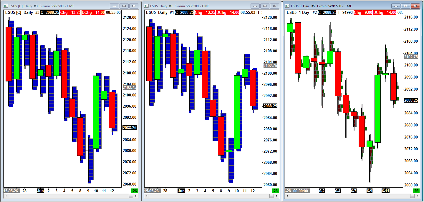 Left Chart: Daily Chart, Continuous Middle Chart: Daily Chart, non-Continuous Right Chart: 1440 minute chart Only far right one looks valid. Can you tell me why the volume bars on the others are all the same? Thanks, Patrick Z |