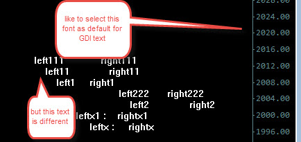 SC Team - I have been trying to select the default font used by the chart text into GDI based text objects and so far not successful. Would you please let me know if there is any way I can get the same text into the GDI text font? Appreciate any input ( please don't mark it as User discussion ). Even better if you can update the default GDI example study to include this text font ). Just wanted to "avoid" creating a font for this and use Chart Text font by default for this ( indirect font). I tried the following but no use. SelectObject(hdc, GetStockObject(DEFAULT_GUI_FONT)); //SelectObject(hdc, GetStockObject(DEVICE_DEFAULT_FONT)); //SelectObject(hdc, GetStockObject(ANSI_FIXED_FONT)); //SelectObject(hdc, GetStockObject(OEM_FIXED_FONT)); //SelectObject(hdc, GetStockObject(SYSTEM_FONT)); Thanks Date Time Of Last Edit: 2015-06-21 16:35:22
