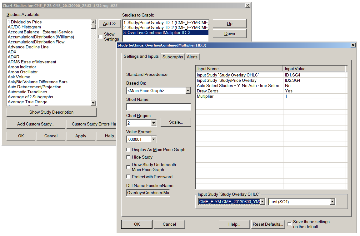 Try this: it will combine the data from two studies. I made it to use the open of study#1, and the "fill blank" data from study#2. This is the choice in "auto mode"; but if you choose "N= non auto select" in the settings; then you can combine your two overlays which each have different settings. It might work for you?... It will try to use the data from study #1. If that data array is empty then it will take the data from study #2. For sure you must "fill blanks" on your second input study. See picture below about study #1 & study #2. #include "sierrachart.h" SCDLLName("Studies951") SCSFExport scsf_OverlaysCombinedMultiplier(SCStudyInterfaceRef sc) { SCSubgraphRef StudyValue = sc.Subgraph[0]; SCInputRef Stdy1 = sc.Input[0]; SCInputRef Stdy2 = sc.Input[1]; SCInputRef PreviousStudies = sc.Input[2]; SCInputRef DrawZeros = sc.Input[3]; SCInputRef Multiplier = sc.Input[4]; SCFloatArray Study1Array; SCFloatArray Study2Array; if (sc.SetDefaults) { sc.GraphName = "OverlaysCombinedMultiplier"; sc.StudyDescription = "//// Two studies should be applied before this one; Study Overlay OHLC & Study/Price Overlay. //// This study will show the Open of the first study. However; If there is no current trade data for this chart -then the last trade data from the second study is used instead. //// Choosing Auto Select Studies = Yes will automatically select the two studies prior to this one & use SG1 OPEN. i.e If this Study has ID:8, then 6&7 are automatically used. Choose free selction if you want to use data other than SG1 OPEN. ////"; sc.AutoLoop = 1; sc.FreeDLL = 0; StudyValue.Name = "StudyValue"; StudyValue.DrawStyle = DRAWSTYLE_LINE; StudyValue.LineWidth = 1; Stdy1.Name = "Input Study `Study Overlay OHLC`"; Stdy1.SetStudySubgraphValues(1, 0); Stdy2.Name = "Input Study `Study/Price Overlay`"; Stdy2.SetStudySubgraphValues(2, 0); PreviousStudies.Name = "Auto Select Studies = Y. No Auto - free Selection = N"; PreviousStudies.SetYesNo(true);; DrawZeros.Name = "Draw Zeros"; DrawZeros.SetYesNo(true); Multiplier.Name = "Multiplier"; Multiplier.SetFloat(1.0f); return; } int i = sc.Index; int ID0 = sc.StudyGraphInstanceID; if (PreviousStudies.GetYesNo()) { int ID1 = (ID0 -2); int ID2 = (ID0 -1); int val = 0; Stdy1.SetStudySubgraphValues(ID1,val); Stdy2.SetStudySubgraphValues(ID2,val); sc.GetStudyArrayUsingID(Stdy1.GetStudyID(),Stdy1.GetSubgraphIndex(),Study1Array); sc.GetStudyArrayUsingID(Stdy2.GetStudyID(),Stdy2.GetSubgraphIndex(),Study2Array); if (Study1Array[i] == 0) { Study1Array[i] = Study2Array[i]; } } else { sc.GetStudyArrayUsingID(Stdy1.GetStudyID(),Stdy1.GetSubgraphIndex(),Study1Array); sc.GetStudyArrayUsingID(Stdy2.GetStudyID(),Stdy2.GetSubgraphIndex(),Study2Array); if (Study1Array[i] == 0) { Study1Array[i] = Study2Array[i]; } } if (ID0 <= 2) {return;} else StudyValue.DrawZeros = DrawZeros.GetYesNo(); StudyValue[i] = Study1Array[i] * Multiplier.GetFloat(); } Date Time Of Last Edit: 2013-06-12 06:16:36
