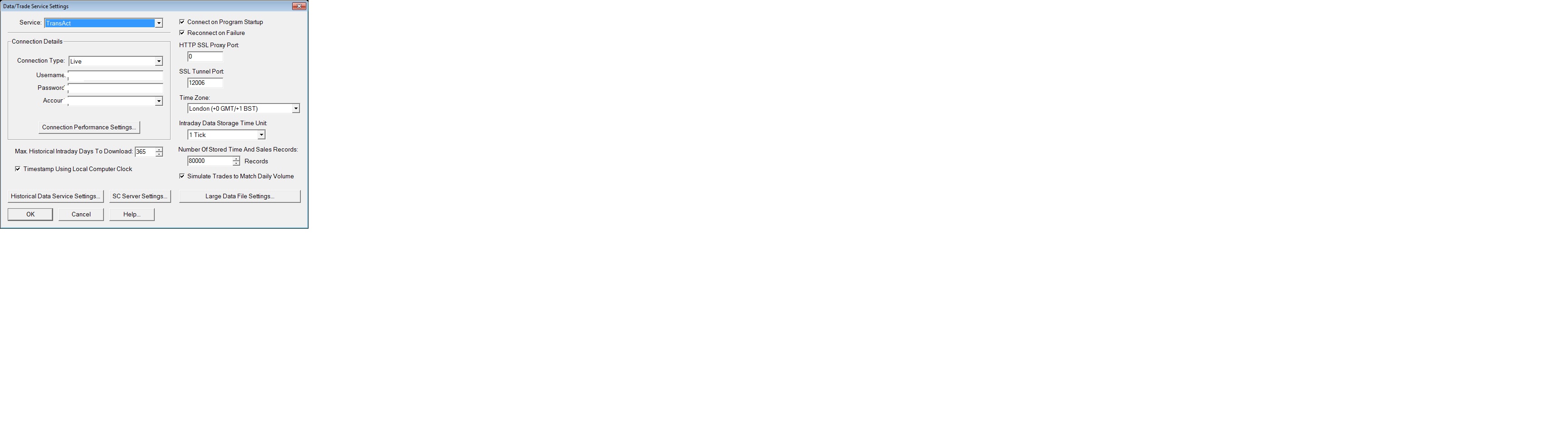 You are running an older version. Please update with Help >> Download Current Version. After that you will see a button named Data Feed Settings in Global Settings >> Data/Trade Service Settings. Also reduce Number of Time and Sales Records to under 10000. It does not need to be as high as you have. Sierra Chart Support - Engineering Level Your definitive source for support. Other responses are from users. Try to keep your questions brief and to the point. Be aware of support policy: https://www.sierrachart.com/index.php?l=PostingInformation.php#GeneralInformation For the most reliable, advanced, and zero cost futures order routing, *change* to the Teton service: Sierra Chart Teton Futures Order Routing Date Time Of Last Edit: 2013-03-27 16:43:47