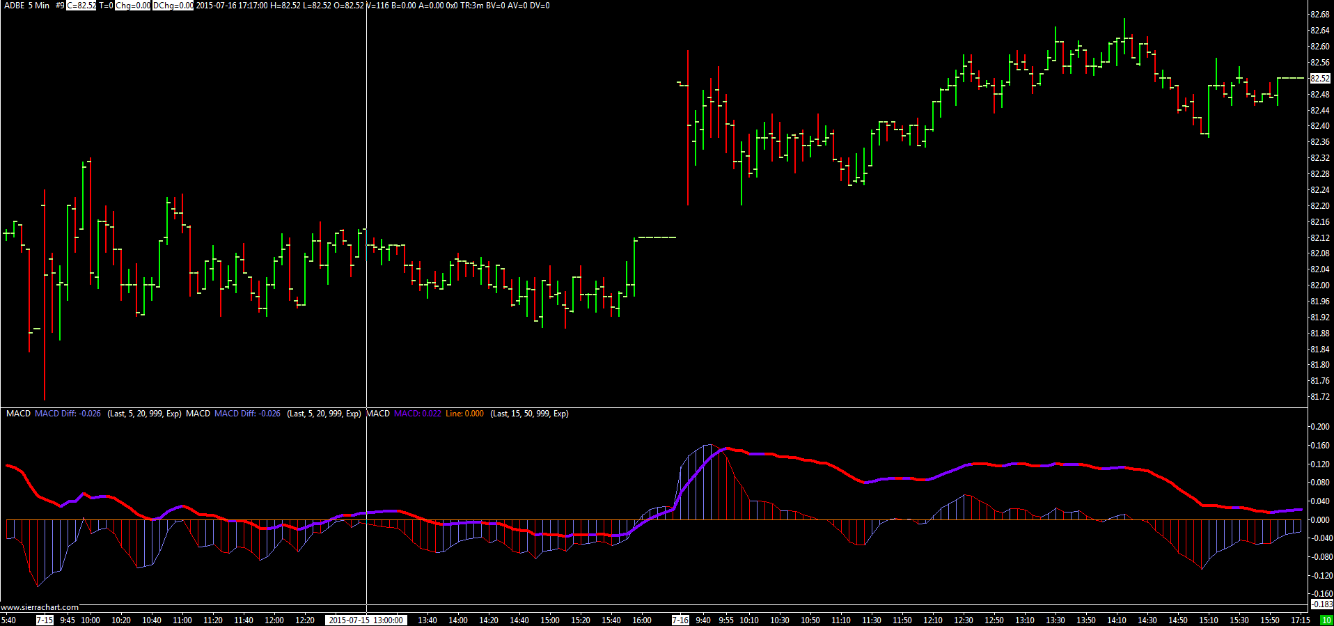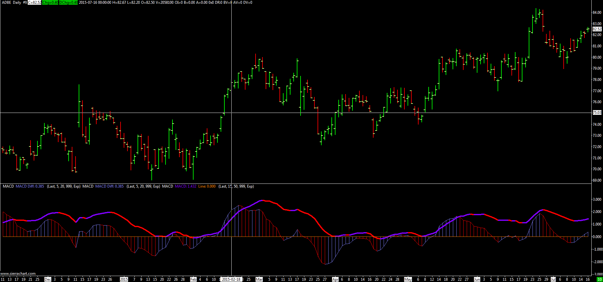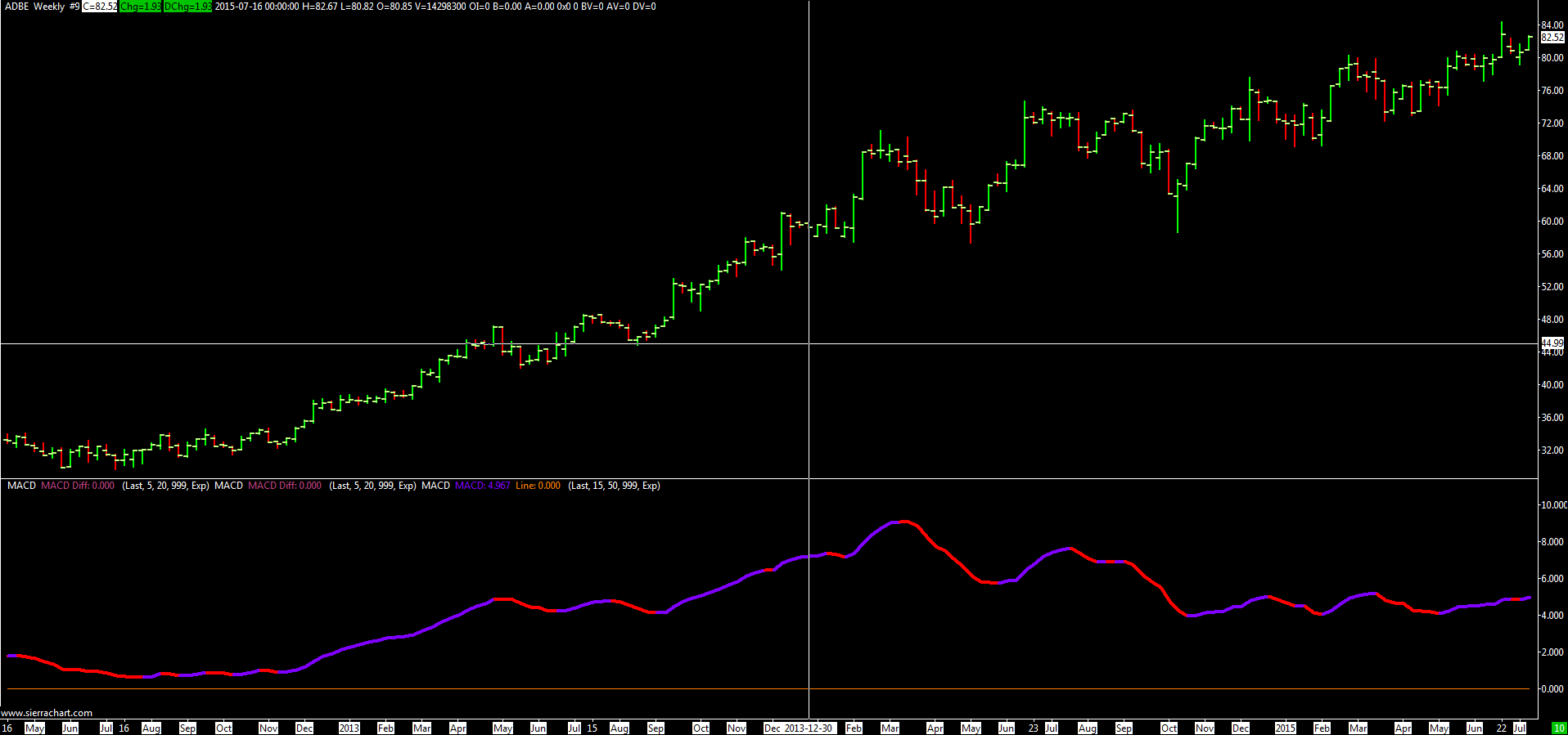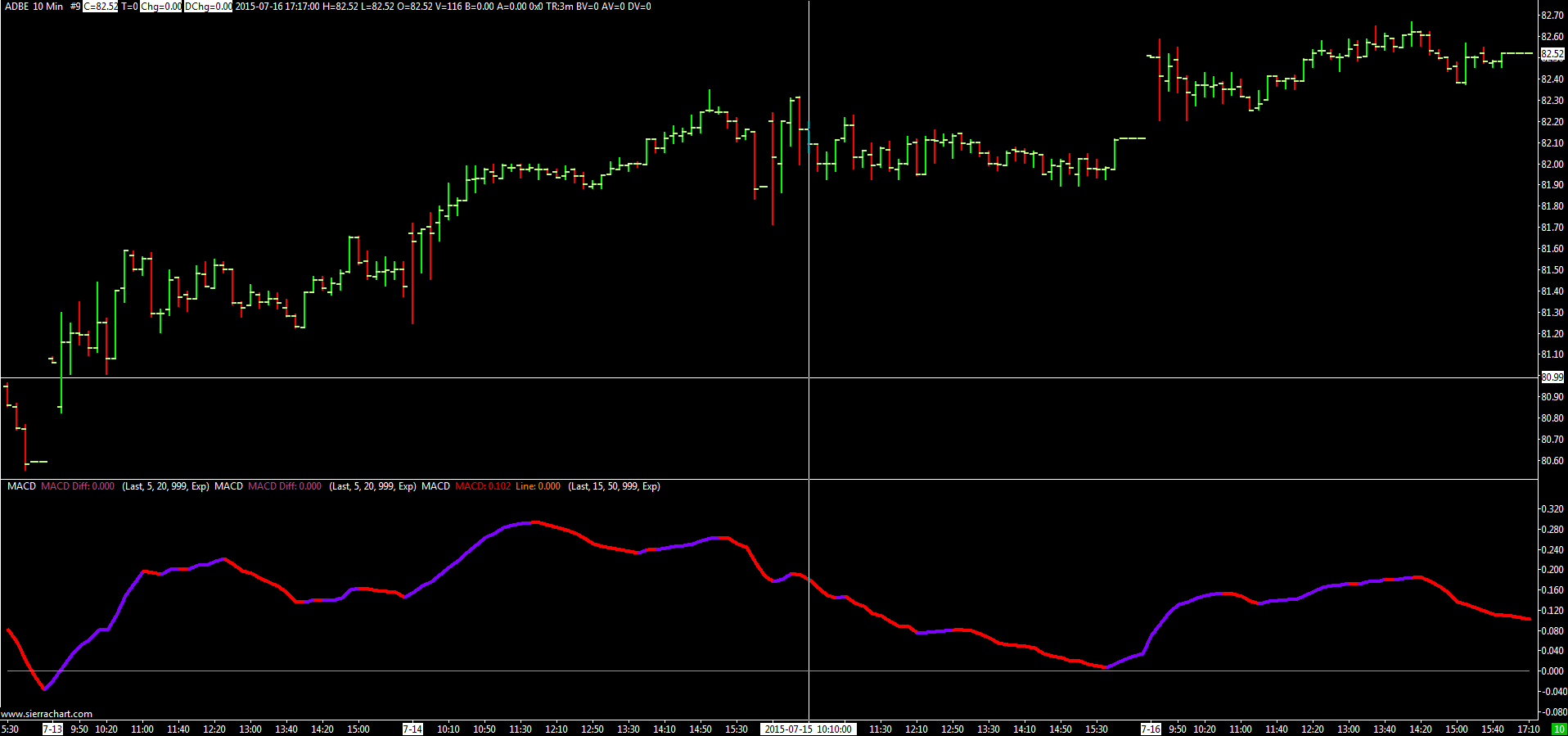 Chart1 is ADBE's daily chart with 2 sets of MACDs. Chart2 is its weekly chart with the same sets of MACDs. Chart3: 5-minute chart. Chart4: 10-minute chart. Chart1: http://www.sierrachart.com/image.php?l=1437135671551.png Chart2: http://www.sierrachart.com/image.php?l=1437135800746.png Chart3: http://www.sierrachart.com/image.php?l=1437135868997.png Chart4: http://www.sierrachart.com/image.php?l=1437135919576.png In above charts, all have the same MACD settings. Please advise. Thanks |