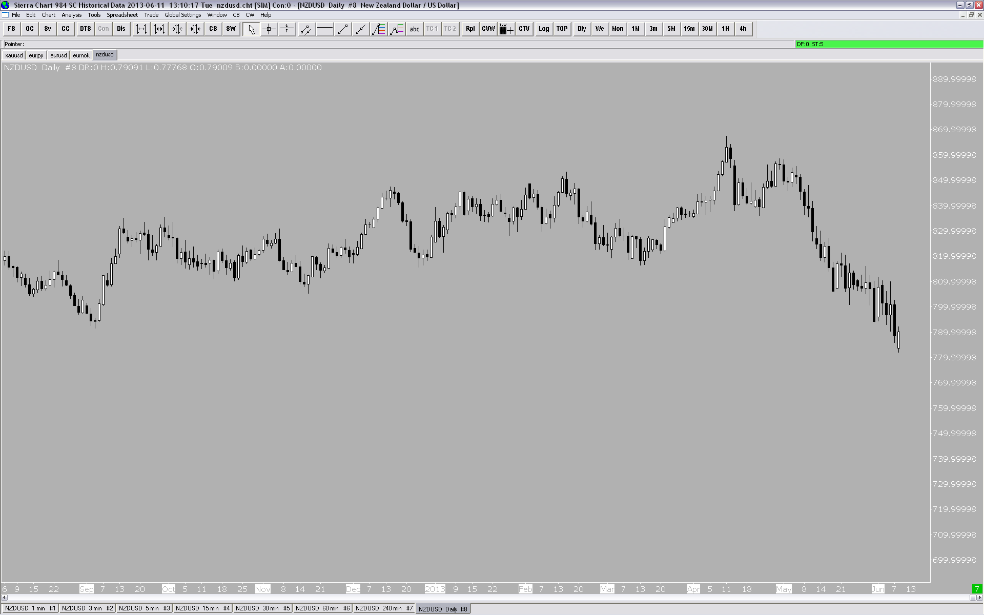 ok fixed but now when trying to display historical daily, weekly, and monthly for NZDUSD, for ex, the data file received from FXCM is dirty, meaning that the data for many periods has the decimal point set in the wrong position, i.e. instead of 0.768904, the price would be listed as 768.904, as a result of which the whole chart, of course, is utterly wrong. i changed the data server to SC Historical Data and get the same result. am i missing something here or is the data file that needs cleaning? |