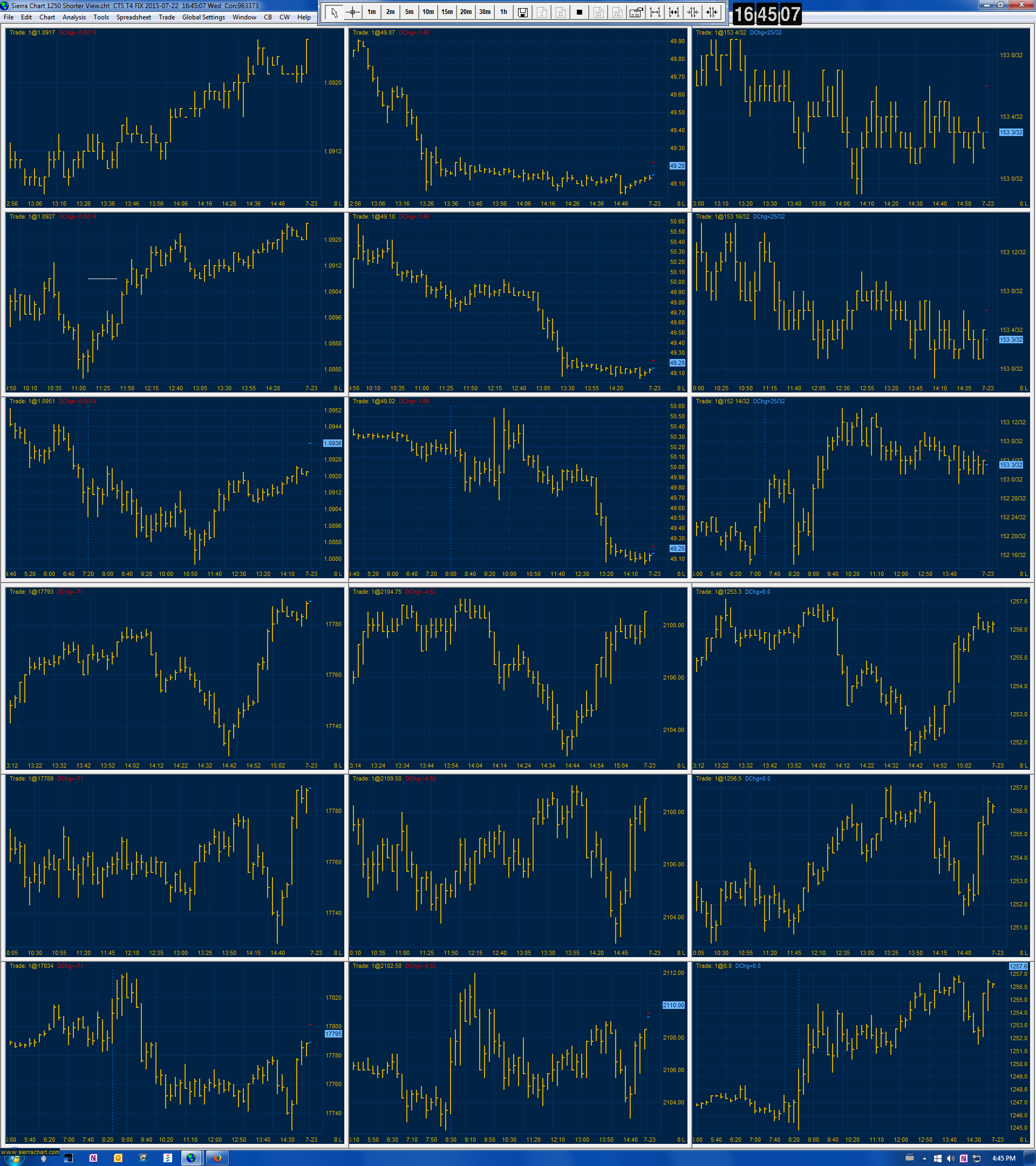 You can have the chart arrangement that you're describing, but it's all done through 1 chartbook, not 4 chartbooks. I use 1 chartbook on 2 monitors, but there's only 1 menu bar and 1 toolbar. In your case, the menu bar would stretch across the top 2 monitors, the tool bar would be wherever you placed it. You have to configure your video card to where each monitor is displaying one quarter of the chartbook. I'm not sure what you'll initially be seeing, but at some point, whether it's now or it was before you configured your video card, you'll need to manually pull the exterior borders (the double arrows) of the chartbook to where the 1 chart book now covers all 4 monitors. Your video card will let you save this configuration as a preset, do that, and you'll probably need to save 1 or 2 more presets, depending on the different things you would use your monitors for. I have three presets, they're all icons on my desktop: 1. Sierra Chart (this is the 2 monitor configuration 2. Disable #1 (this disables the upper monitor) 3. Disable #2 (this disables the lower monitor). Now populate the chartbook with your individual charts, and arrange them into the "4 chartbook" display that you wanted. The outer borders of the charts that are at the edges of each monitor can be perfectly fitted to each monitor. I've included a snapshot of my chartbook, but it's not going to display right when viewing it on 1 monitor. My chartbook measures 35" wide and 39" vertically, and every individual chart that you see measures 11.5" x 6.25". If you really want it, you can do it, it's just going to take some time. http://www.sierrachart.com/image.php?l=1437601510294.png |