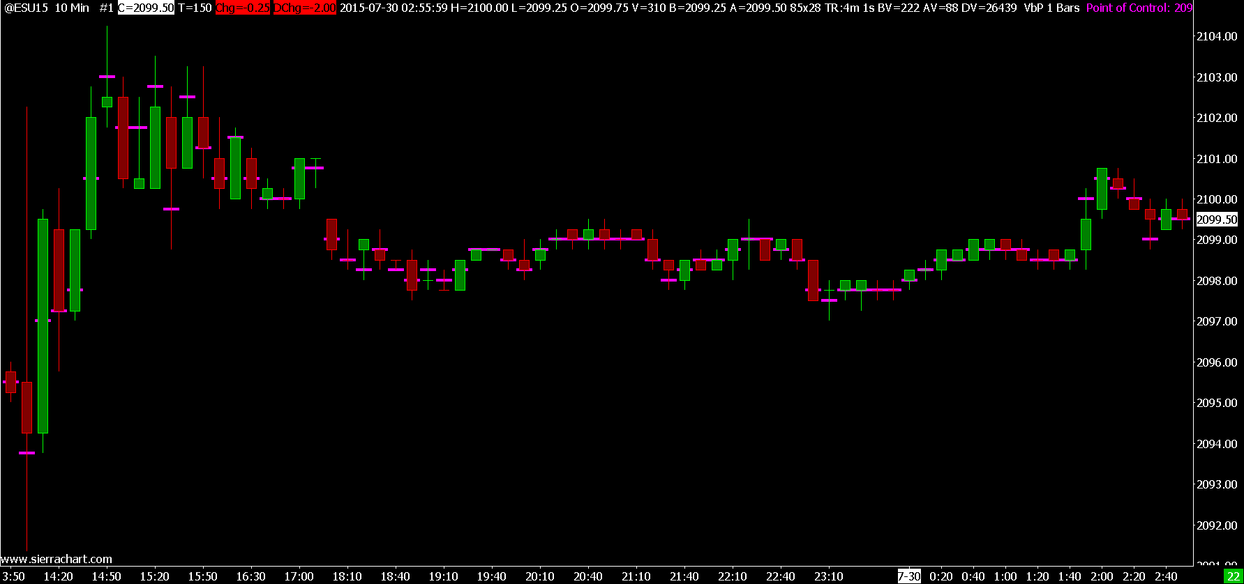 We thought this could not be done with any of the standard studies but it can be with the Volume by Price study. Here is an image of the chart: http://www.sierrachart.com/image.php?l=1438239367869.png Refer to the attachment for the settings. Only the Point of Control Subgraph is set to be visible and uses a Dash Draw Style. Sierra Chart Support - Engineering Level Your definitive source for support. Other responses are from users. Try to keep your questions brief and to the point. Be aware of support policy: https://www.sierrachart.com/index.php?l=PostingInformation.php#GeneralInformation For the most reliable, advanced, and zero cost futures order routing, *change* to the Teton service: Sierra Chart Teton Futures Order Routing Date Time Of Last Edit: 2015-07-30 06:58:23
