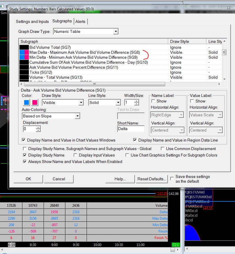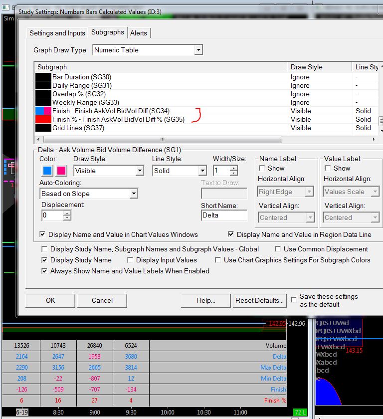 Hello, It's difficult for me to explain because i'm french but i will try.. Maximum Ask Bid Vol Diff to Closing Ask Bid Vol Diff: This is the difference between the: Maximum Ask Volume and Bid Volume difference for a Numbers Bar, and the closing Ask Volume and Bid Volume difference for the same Numbers Bar. For this, i don't know because i'm not using it What is the final Ask Volume and Bid Volume difference? What is it? the finish is the pullback from the maximum or minimum delta And when you need Finish % (finish askvol bidvol diff %) - what should I take as the base to calculate %? i think the base to calculate is the same than delta% i'm not sure that can help you, sorry If it's to complicated, don't worry Thanks anyway Thierry PS:i show you my settings |