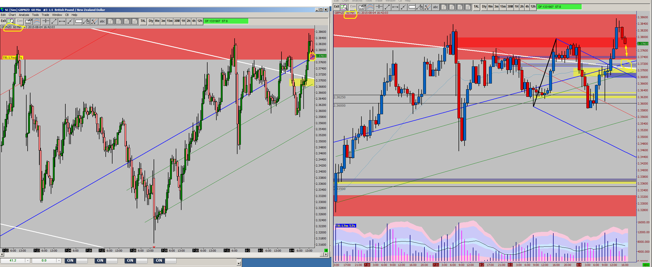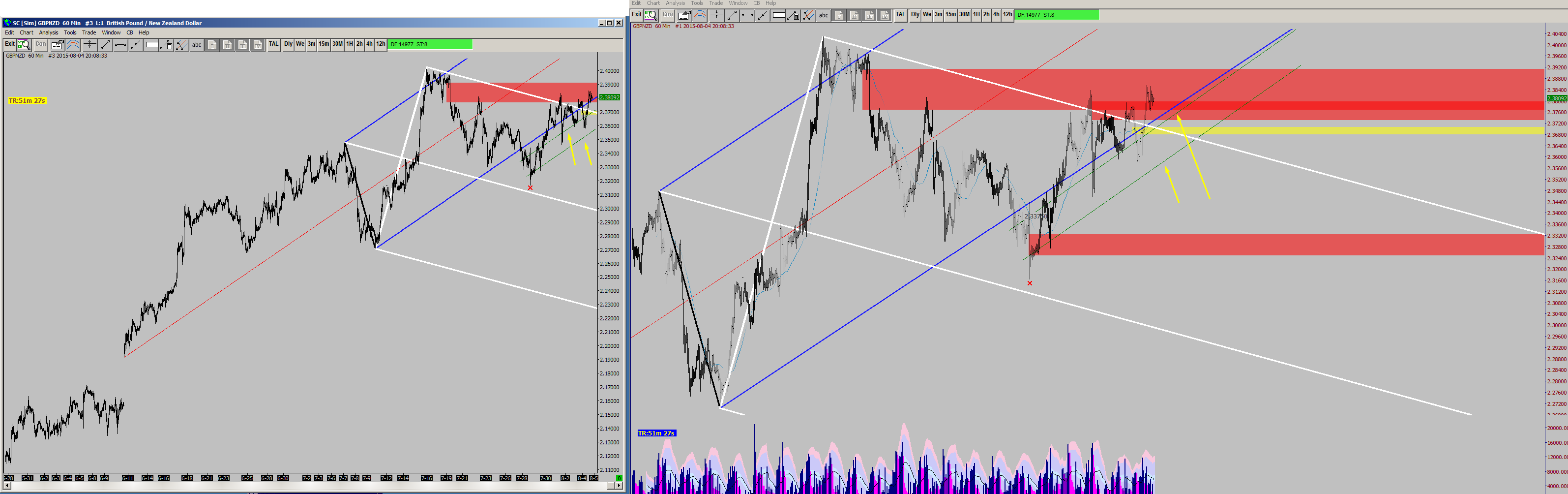 Here are two more pictures showing it a bit more clear. Notice the green lines are not even parallel on the second chart. The only difference of the charts is the number of days loaded.