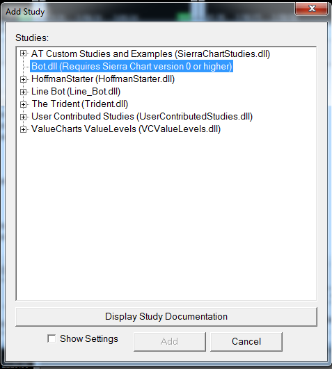 In the next release of Sierra Chart, the error text in parentheses after the DLL name in the Add Custom Study window will indicate what the problem is.