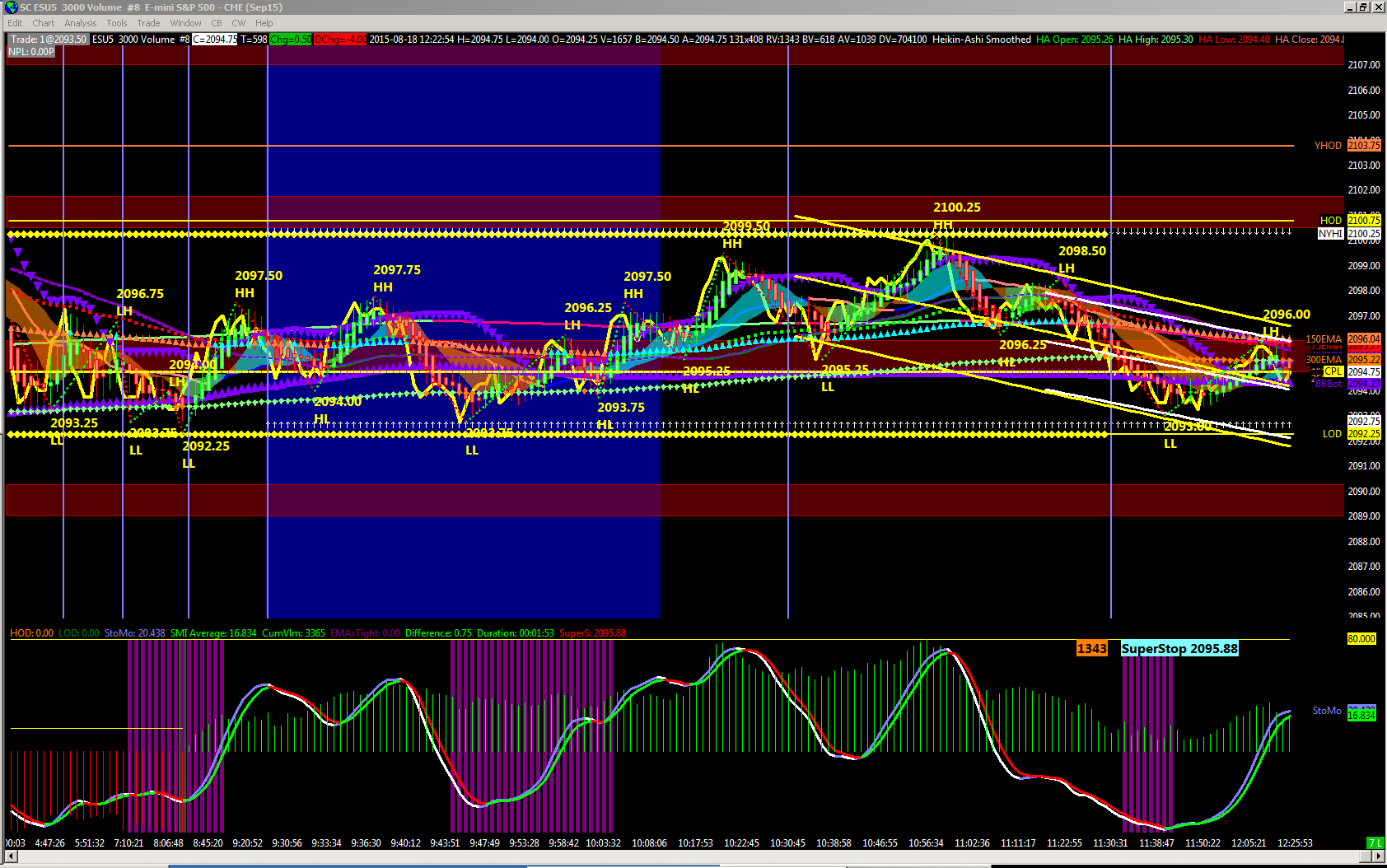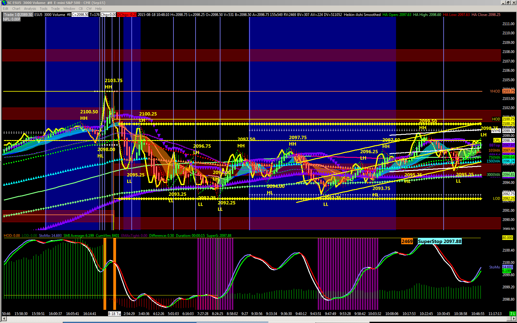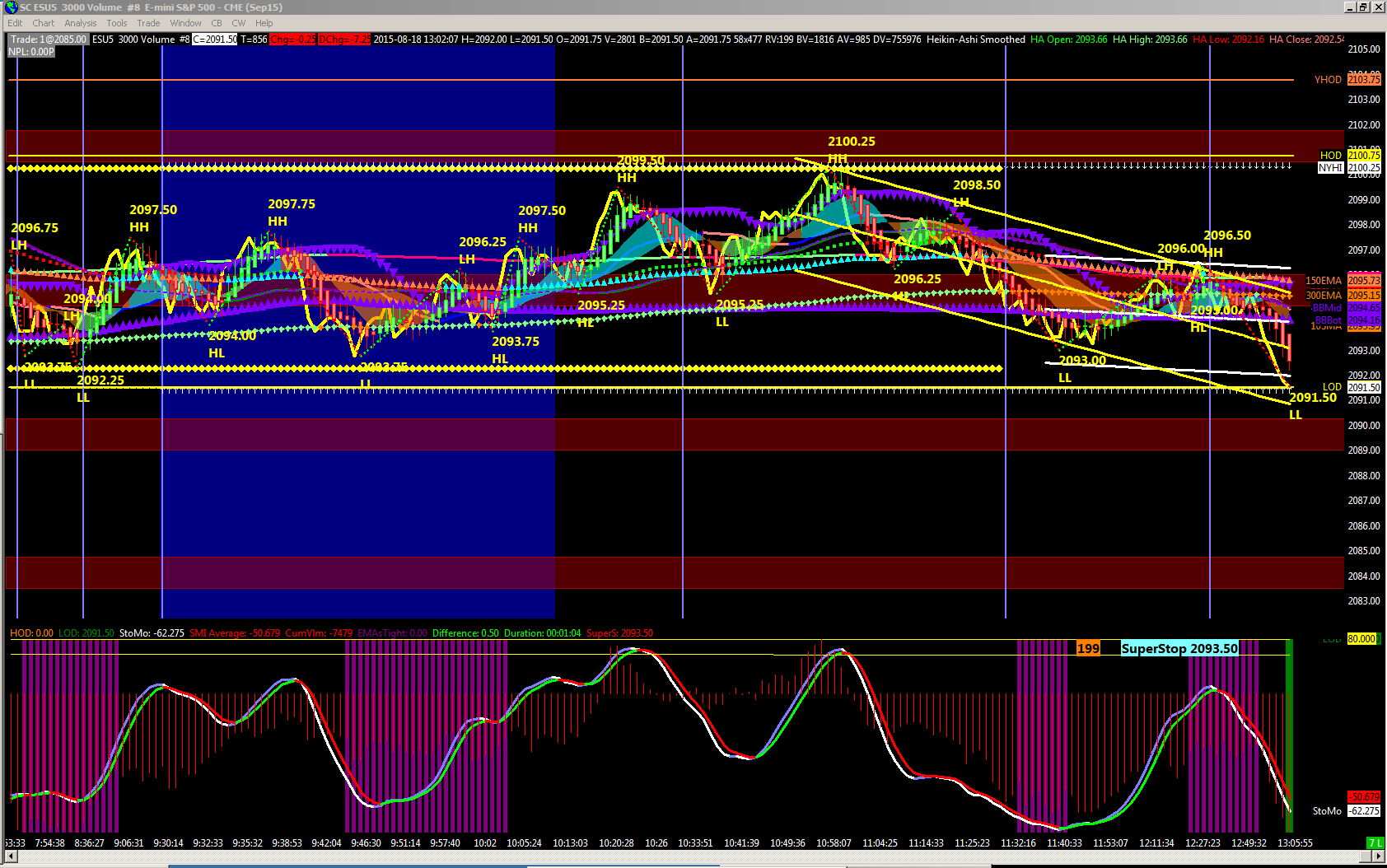 OK - here are some screen shots for today 0818. Note that the Cim Vol bars that were green in the earlier time charts were all repainted red when a new LOD was hit at 2091.50 at 1302 edt. Note that the reverse repaint also occurs if a new HOD occurs, changing the previous red bars to green. I do not believe this is correct. And it is certainly misleading. Thanks |