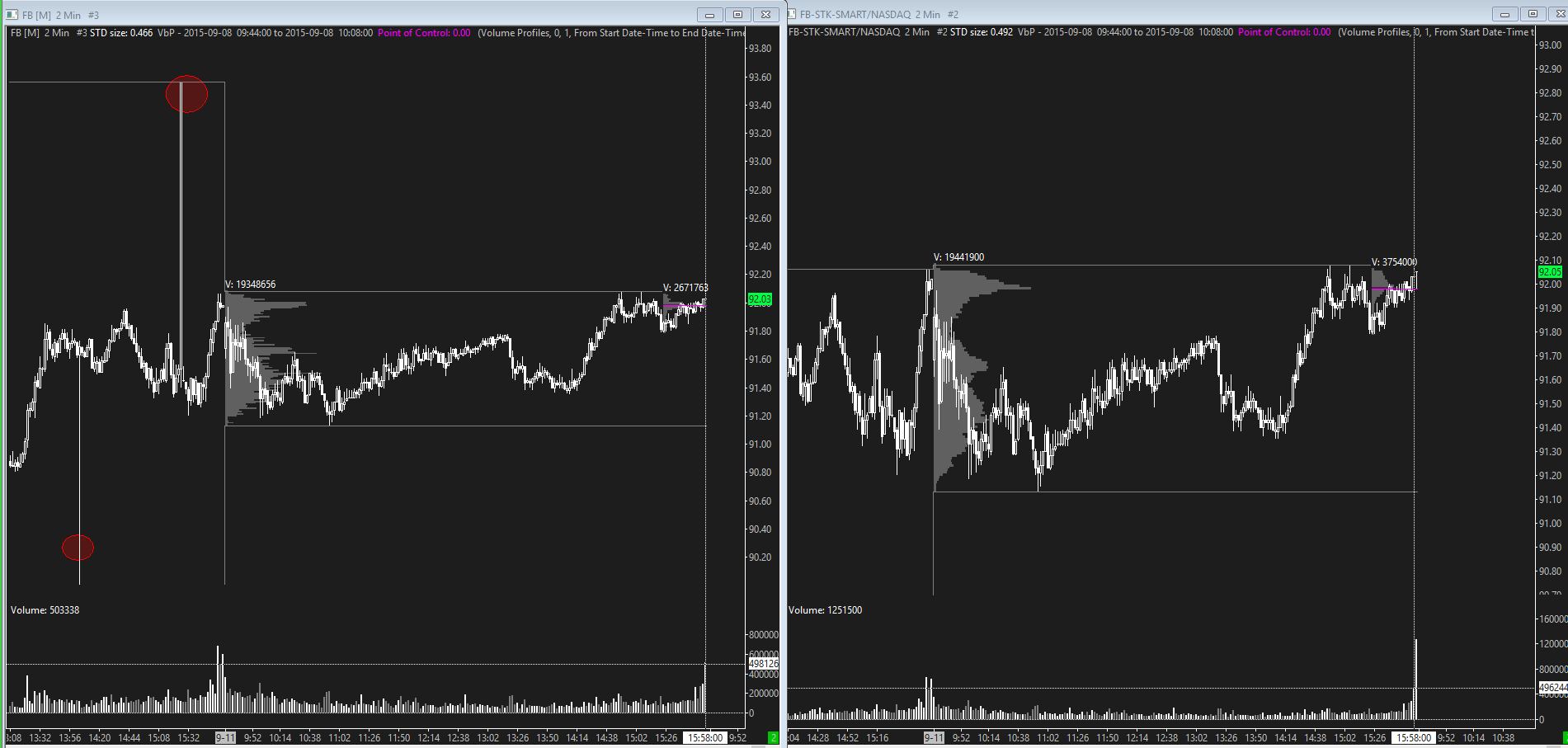 Cheers, Just had a quick look at some charts. Volume doesn't quite look right- there's some bad ticks and unusual volume reporting. Could be something from my end? Here's an example using FB- as you can see there's some bad ticks and also the EOD cross trade appears to be missing, however it still looks like it's been included in the total volume for the day. |