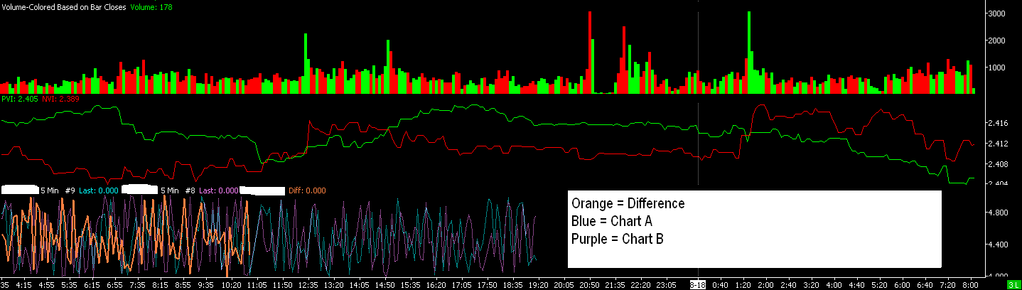 Hi SC Team, I am having some problems with the Study Subgraphs Difference study not updating with new ticks. Chart A: 5 minute line chart, source is custom .scid binary write ~10 second intervals Chart B: 5 minute line chart, source is custom .scid binary write ~10 second intervals Chart C: 5 minute candle chart, source is AUDUSD (SC FXCM intraday). Note 1: On chart C I have two Study/Price Overlay studies, one referencing Chart A (last) and another referencing Chart B (last). Note 2: On chart C I also have a Study Subgraphs Difference study, to calculate the difference between the two Study/Price Overlay studies. The problem is that the Study Subgraphs Difference study is not updating in line with two Study/Price Overlay studies. The two Study/Price Overlay studies update in line with the Chart A and B last values. Also a forced recalculate does update the Study Subgraphs Difference study value, but this isn't practical in live trading. Thankyou. Screenshot attached Update: The difference study does update when the data has caught up to the current bar. Please consider this a low priority item. Date Time Of Last Edit: 2015-08-18 08:57:27