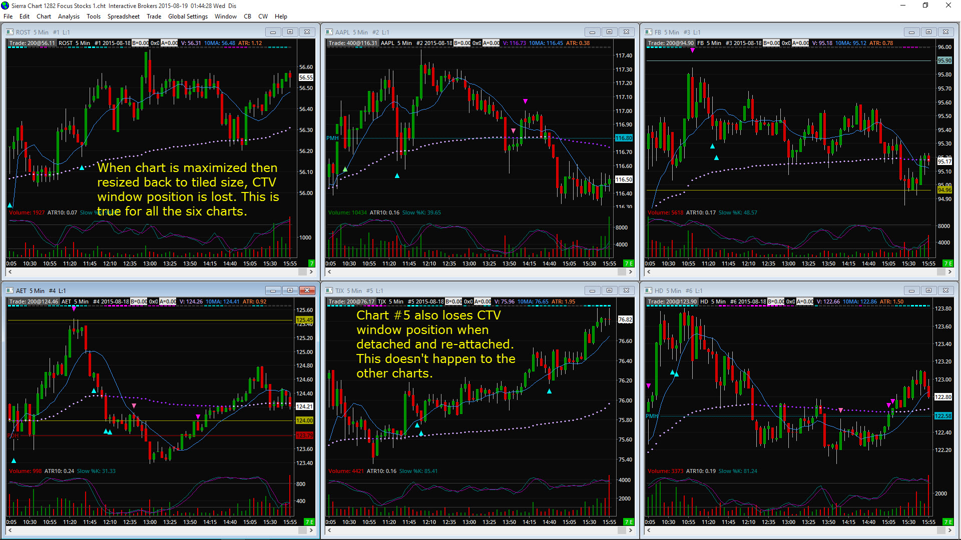 This is by design: When I maximize a chart and resize it back to tiled size, SC loses the saved CTV window position for the chart. It will move relative to the top left of the chart window to maintain its identical position. I always put the CTV window to the upper left hand corner of the chart window. When I maximize and resize back, the CTV windows for the different charts are all over the place, some at the bottom, middle or right side of the chart, and chart #5 is always partially below screen view. I don't understand how they are relative to the top left of the chart. Maybe defaulting near the upper left hand corner of the chart window whether tiled or maximized is a better alternative, in my opinion. |