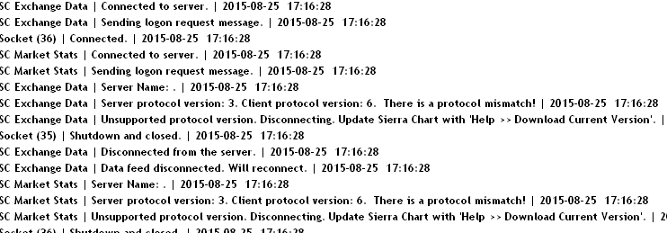 i desinstalled Avast from my computer but the problem still present: Software version: 1282 | 2015-08-25 21:53:57 Uses New Spreadsheets | 2015-08-25 21:53:57 Usage end date: 2016-02-02 | 2015-08-25 21:53:57 Enabled for: Advanced Features. | 2015-08-25 21:53:57 Enabled for: Advanced Features 2. | 2015-08-25 21:53:57 Enabled for: Sierra Chart Historical Data Service. | 2015-08-25 21:53:57 Enabled for: Sierra Chart Real-Time Exchange Data Feed. | 2015-08-25 21:53:57 Enabled for: EUREX exchange. | 2015-08-25 21:53:57 Received 1 data feed usernames. | 2015-08-25 21:53:57 Allow Support for Sierra Chart Data Feeds is enabled. | 2015-08-25 21:53:57 Current selected Data/Trading service: SC Exchange Data | 2015-08-25 21:53:57 Chart Update Interval: 500 | 2015-08-25 21:53:57 Time Zone: +02:00:00 (CET+01CEST+01,M3.5.0/02:00,M10.5.0/03:00) | 2015-08-25 21:53:57 2015-08-25 21:53:57 Local computer clock time | 2015-08-25 21:53:57 2015-08-25 19:53:57 GMT time | 2015-08-25 21:53:57 2015-08-25 21:53:57 Time zone adjusted time | 2015-08-25 21:53:57 Time difference to server time: 2 seconds. | 2015-08-25 21:53:57 Program path: C:\SierraChart\ | 2015-08-25 21:53:57 Data Files path: C:\SierraChart\Data\ | 2015-08-25 21:53:57 OS Version Number: 5.1 | 2015-08-25 21:53:57 Locale Information: C | 2015-08-25 21:53:57 Chart #16 is performing a full recalculation because it has been tagged. Chartbook: DAXFUTURE.cht | 2015-08-25 22:11:50 Chart #16 has tagged chart #20 for full recalculation. Chartbook: DAXFUTURE.cht | 2015-08-25 22:11:52 Chart #21 is performing a full recalculation because it has been tagged. Chartbook: DAXFUTURE.cht | 2015-08-25 22:11:52 Chart #21 has tagged chart #20 for full recalculation. Chartbook: DAXFUTURE.cht | 2015-08-25 22:13:09 Socket (37) | Connected. | 2015-08-25 22:13:09 SC Market Stats | Connected to server. | 2015-08-25 22:13:09 SC Market Stats | Sending logon request message. | 2015-08-25 22:13:09 SC Market Stats | Server Name: . | 2015-08-25 22:13:09 SC Market Stats | Server protocol version: 3. Client protocol version: 6. There is a protocol mismatch! | 2015-08-25 22:13:09 SC Market Stats | Unsupported protocol version. Disconnecting. Update Sierra Chart with 'Help >> Download Current Version'. | 2015-08-25 22:13:09 * Socket (37) | Shutdown and closed. | 2015-08-25 22:13:09 SC Market Stats | Disconnected from the server. | 2015-08-25 22:13:09 SC Market Stats | Data feed disconnected. Will reconnect. | 2015-08-25 22:13:09 Using username 0 | 2015-08-25 22:13:10 SC Exchange Data | Connecting to the server scdf1.sierracharts.com. Port 443 | 2015-08-25 22:13:10 Socket (0) | Resolved address ds6.sierracharts.com to IP 8.18.161.131 | 2015-08-25 22:13:10 Chart #17 is performing a full recalculation because it has been tagged. Chartbook: DAXFUTURE.cht | 2015-08-25 22:13:10 Chart #20 is performing a full recalculation because it has been tagged. Chartbook: DAXFUTURE.cht | 2015-08-25 22:13:11 Socket (38) | Connected. | 2015-08-25 22:13:49 SC Exchange Data | Connected to server. | 2015-08-25 22:13:49 SC Exchange Data | Sending logon request message. | 2015-08-25 22:13:49 SC Exchange Data | Server Name: . | 2015-08-25 22:13:49 SC Exchange Data | Server protocol version: 3. Client protocol version: 6. There is a protocol mismatch! | 2015-08-25 22:13:49 SC Exchange Data | Unsupported protocol version. Disconnecting. Update Sierra Chart with 'Help >> Download Current Version'. | 2015-08-25 22:13:49 * Socket (38) | Shutdown and closed. | 2015-08-25 22:13:49 SC Exchange Data | Disconnected from the server. | 2015-08-25 22:13:49 SC Exchange Data | Data feed disconnected. Will reconnect. | 2015-08-25 22:13:49 SC Market Stats | Connecting to the server ds4.sierracharts.com. Port 443 | 2015-08-25 22:13:49 Socket (0) | Resolved address ds4.sierracharts.com to IP 204.11.49.26 | 2015-08-25 22:13:49 File >> Disconnect selected. | 2015-08-25 22:13:51 Socket (39) | Shutdown and closed. | 2015-08-25 22:13:51 SC Market Stats | Disconnected from the server. | 2015-08-25 22:13:51 SC Exchange Data | Disconnected from the server. | 2015-08-25 22:13:51 SC Exchange Data | Disconnected. | 2015-08-25 22:13:51 Date Time Of Last Edit: 2015-08-26 05:43:40