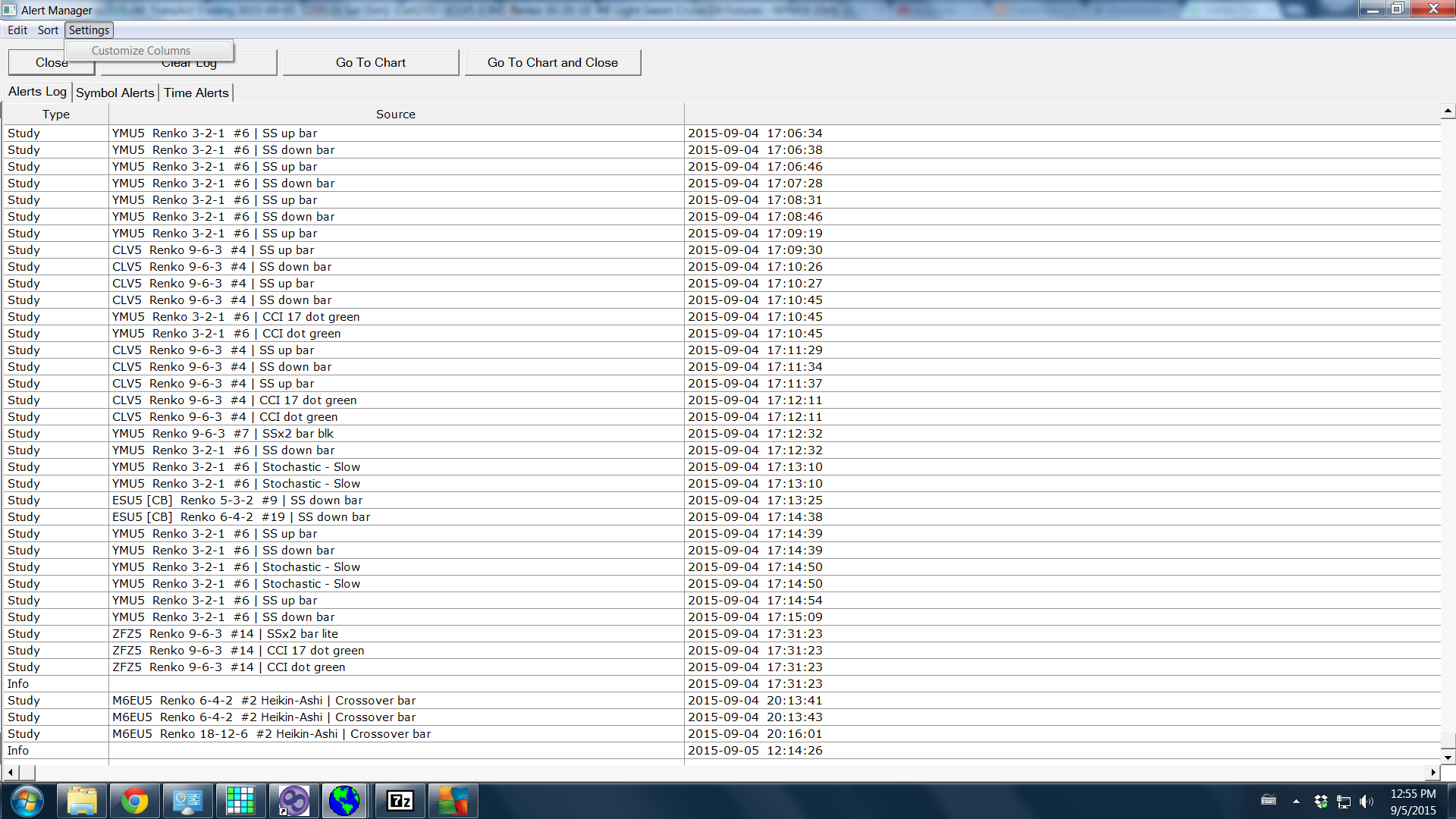 Yes, most of them are alerts on studies, some are alerts on charts, there might be some alerts on drawings, the point is that none of them are at all complicated, none of them have changed and the problem seems to be with the log on this machine only. Edit: The log on that machine is not listing other details of the alerts either, such as the formulas. The entries are supposed to look like this (boldface added): Alert - Chart: M6EZ5 Renko 9-6-3 #11 | Study: CCI dot red | Formula: =CROSSFROMABOVE(ID9.SG1,ID9.SG3) is TRUE. | Last Price: 1.1323 | Bar Start Time: 2015-09-14 12:59:47 | No alert sound/email Alert - Chart: YMZ5 [CB] Renko 6-4-2 #5 Heikin-Ashi | Study: CCI 14 | Formula: =CROSSFROMABOVE(SG1,SG3) is TRUE. | Last Price: 16274 | Bar Start Time: 2015-09-14 14:02:12 | No alert sound/email Alert - Chart: TICK-NYSE [M] 1 Min #4 | Study: Bollinger Bands | Formula: =OR((C>SG1),(C<SG3)) is TRUE. | Last Price: 410 | Bar Start Time: 2015-09-14 14:37:00 | Alert: Andate a Europa Alert - Chart: TICK-NYSE [M] 1 Min #4 | Formula: =OR(CROSSOVER(C,-600),CROSSOVER(C,-1000),CROSSOVER(C,600),CROSSOVER(C,1000)) is TRUE. | Last Price: 652 | Bar Start Time: 2015-09-14 14:55:00 | Alert: Minuteman Date Time Of Last Edit: 2015-09-14 19:00:31
