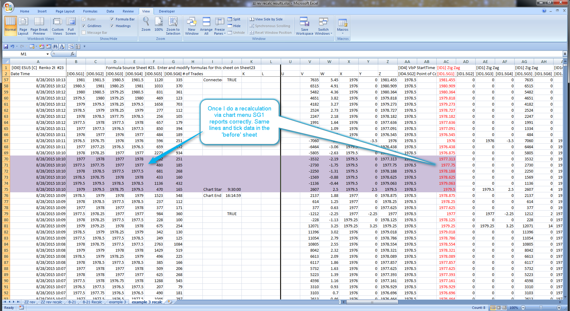 Hope you are having a good labor day weekend; I have been wrestling with why my rotations calculations off the Zig Zag indicator within a (new spreadsheet) are not working requiring constant "recalculations". I took some time this weekend to try and find out what is going on and I think I have it pinned down. I copied the data off the SC (new) spreadsheet in real time while this was happening (I saw my rotations appearing off on the chart) and put it into Excel so I could look at it later. I also copied the data after I did a recalculation and put into an Excel tab next to the 'before' data. I see that SG1 of the Zig Zag is repeating the same value for several ticks; once I do the recalculation the proper SG1 values appear; I have highlighted the area on the sheets (before and after) and have attached them to this support request. Could you look at this and tell me is this proper operation of the Zig Zag? And is this a possible bug or have I done something wrong here. The chart that this is tracking is a ESU5, 2t Renko, OEC data feed and have attached a view of that chart and the Zig Zag settings as well, thx... Steve Date Time Of Last Edit: 2015-09-06 22:22:57