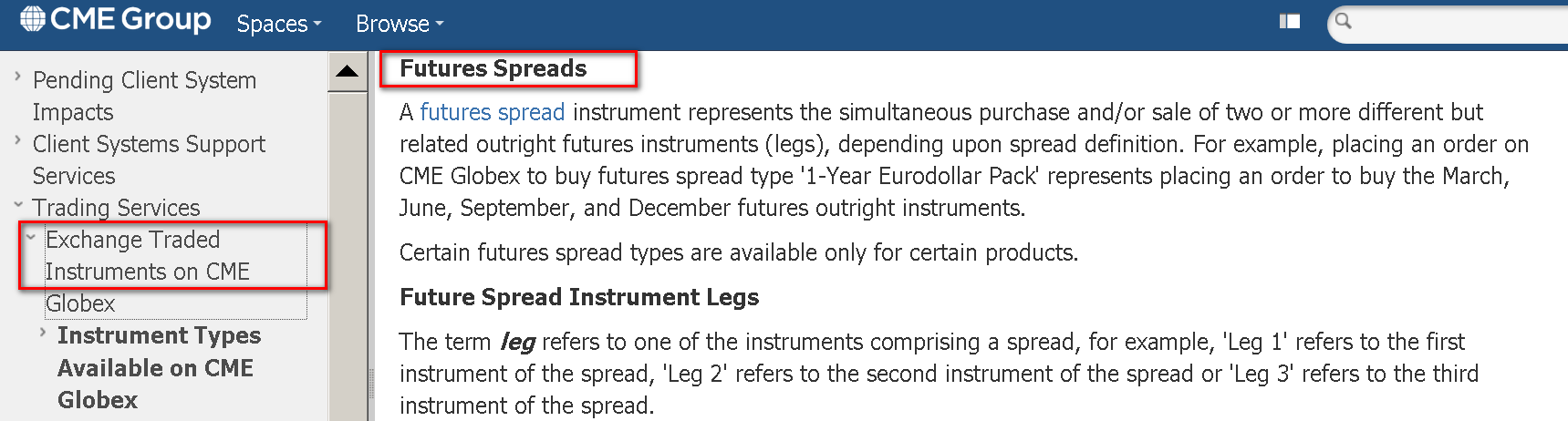 So on the link you posted: http://www.cmegroup.com/confluence/display/EPICSANDBOX/Futures+Spreads, on that link I cannot see one reference to "exchange traded spread", but there are multiple mentions of 'implied spreads' although I suspect that that page has not been fully updated with CME offerings. The listing in general is about futures spreads and its general spread trade examples which might be about two contracts entered into at the same time with the risk that one or both might move, so for example a market order might be completed at a different spread price than expected, and a limit order might end up with only one side of the spread filled. This might not be a good example, but I am trying to fit this response in order to highlight the point of an 'implied spread trade'. An 'implied spread' trade has a fixed ask bid for the spread, so with a limit order for example, you would end up with either obtaining the spread at your specified value or you would not get filled. You cannot end up with only one leg of the spread. The CME offer implied spreads on some spread trades, but not all. The do offer it on crude oil spread trades, and so most I assume would use the 'implied spreads' to trade the crude oil calendar spread. Of course even though the CME offers implied spreads, it would be possible to trade the CME crude oil spread by just going long and short the two appropriate crude oil futures contracts if you wanted. Implied spreads are a wonderful invention and if your offering is the implied spread, then that is wonderful as well! The question is if your symbol is prompting data from the CME implied spreads or from a CME mathematical process on two futures contracts? Here is a link on CME implied spreads http://www.cmegroup.com/confluence/display/EPICSANDBOX/Implied+Orders |