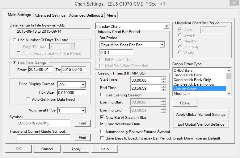 Three other things related to this. 1. The attached screenshot is of an "Options on Futures" chart I loaded. The Bid and Ask Prices (shown in red and yellow text at the top right of the screenshot) will only show up as 0.000 no matter where I scroll the chart. Any idea why this is happening? 2. When I add the "Bid & Ask Prices" study to the chart mentioned in item 1 nothing happens. In other words, no additional lines or marks appear on the chart. Any idea why this is? 3. I am unable to get the chart mentioned in item 1 to load more then 1 days worth of data. The setting I have the chart on are show in attached screenshot "2.jpg" thanks! |