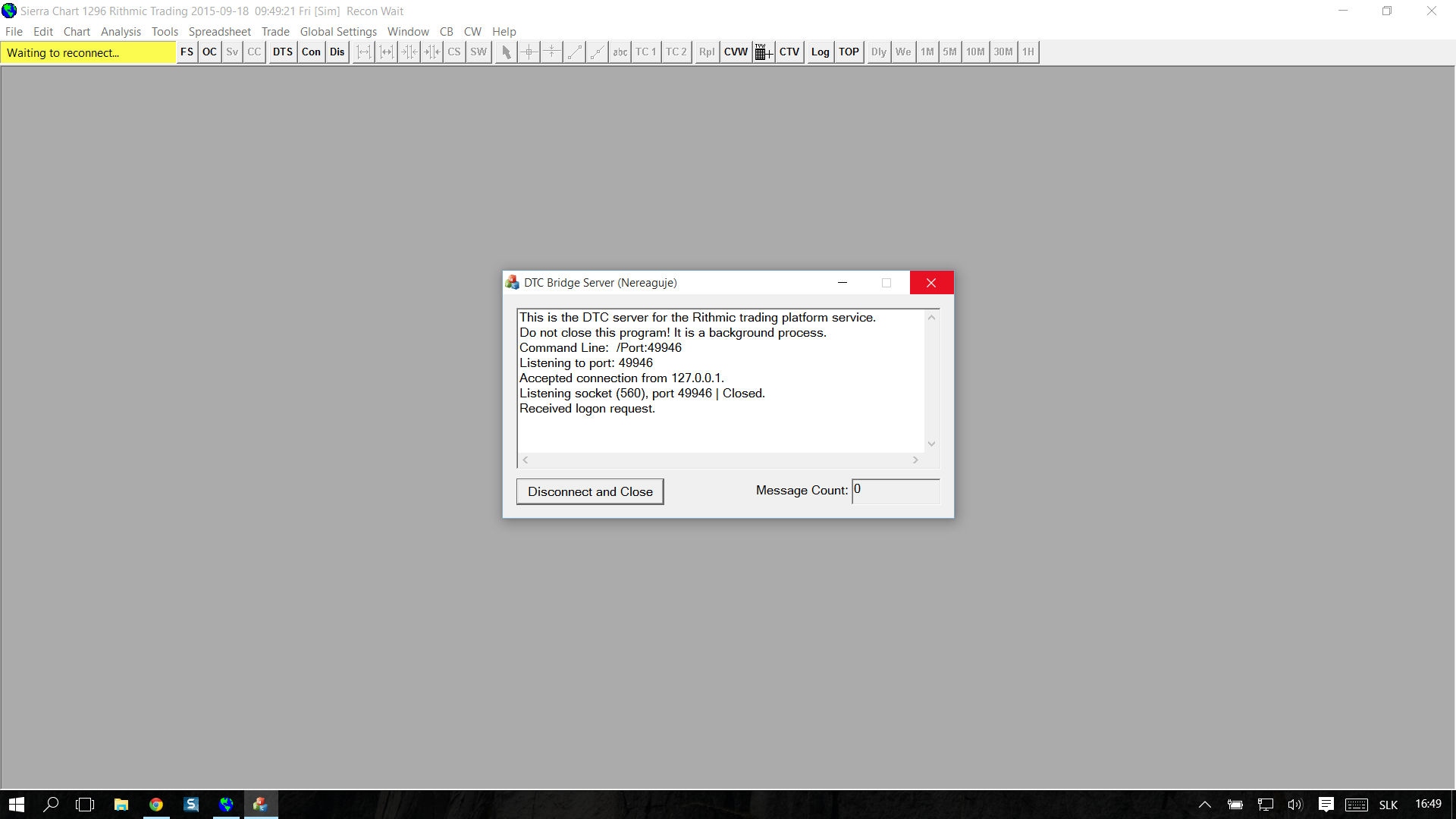 We see you are having trouble connecting to Rithmic which is a very common problem. Most likely you are getting a "permission denied" error. Refer to step 17 here: Rithmic Trading Platform Service: Setup Instructions Sierra Chart Support - Engineering Level Your definitive source for support. Other responses are from users. Try to keep your questions brief and to the point. Be aware of support policy: https://www.sierrachart.com/index.php?l=PostingInformation.php#GeneralInformation For the most reliable, advanced, and zero cost futures order routing, *change* to the Teton service: Sierra Chart Teton Futures Order Routing |