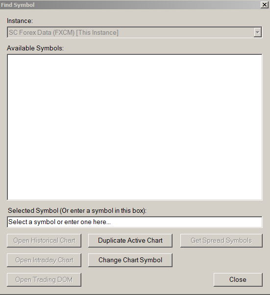 I'm not able to see any symbols using SC Forex Data (FXCM) when I select File-->Find Symbol. Could you please help me with this. Thanks
