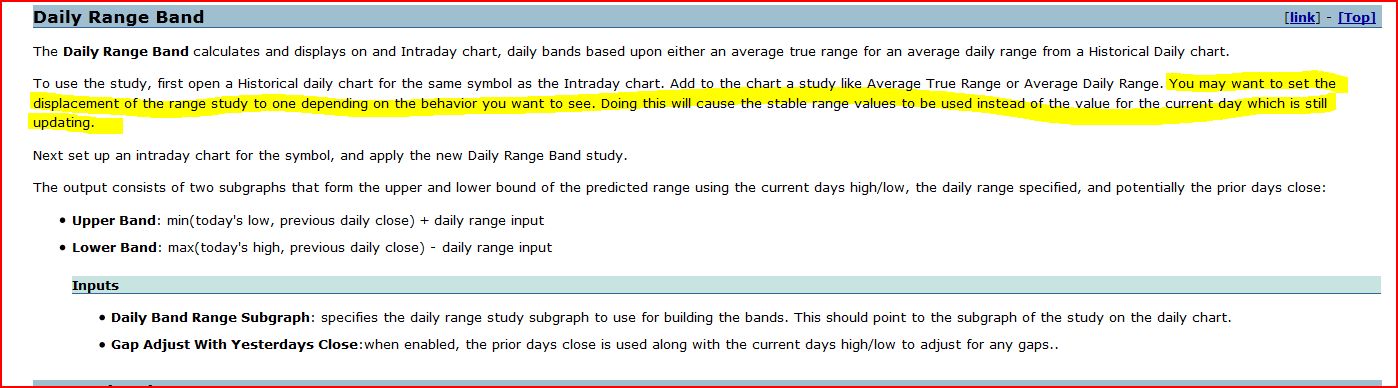 See attached screen grab of your documentation for the Daily Range Bar study. The highlighted piece says to apply a displacement to the ATR study (or ADR study if using that one) so that the ATR is caluclated EXCLUDING today's trading - this is what I want. However neither of the ATR or ADR studies offer a displacement option in 'Setting & Inputs'. Could you confirm that therefore by default both the ATR and ADR studies EXCLUDE current days trading. Thanks |