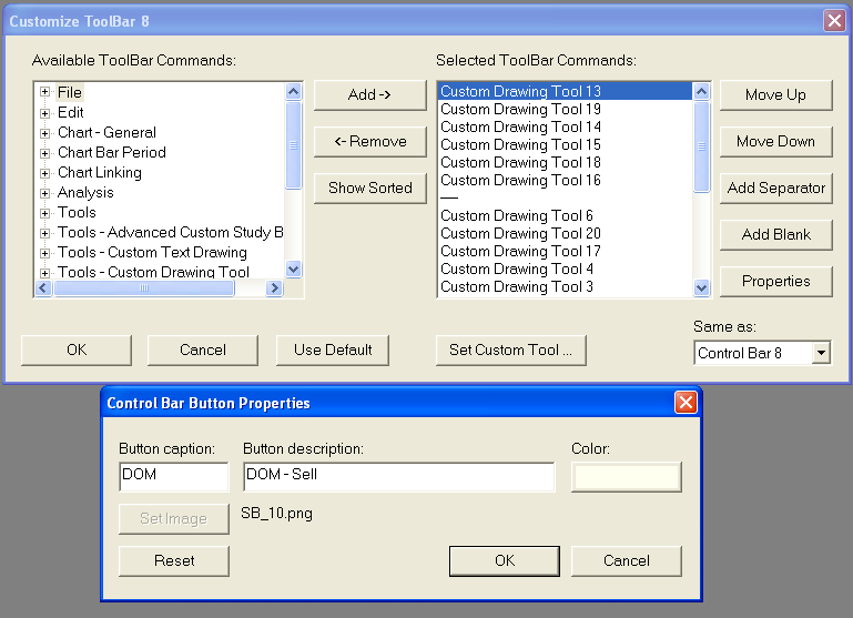 I updated to prerelease 1327. Problem described in the post #10 still there is. If i do: Customize ToolBar X --> Properties, for the Custom Drawing Tool, then i can not set the Set Image. See pic. |