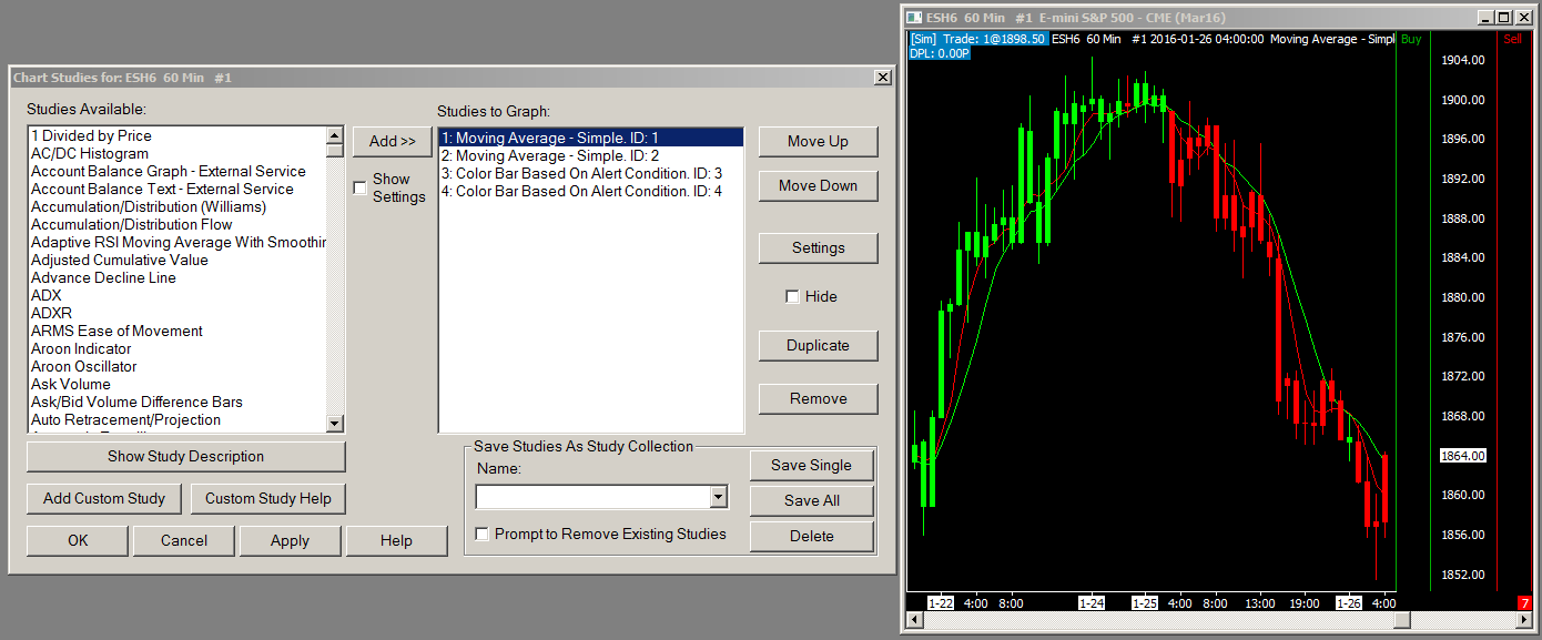 Use two instances of the Color Bar Based On Alert Condition study, one for each color, with these formulas on the respective Alerts tab: Green: =ID1.SG1>ID2.SG1 Red: =ID1.SG1<ID2.SG1 where the faster MA is ID1 and the slower MA is ID2. Edit as needed. |