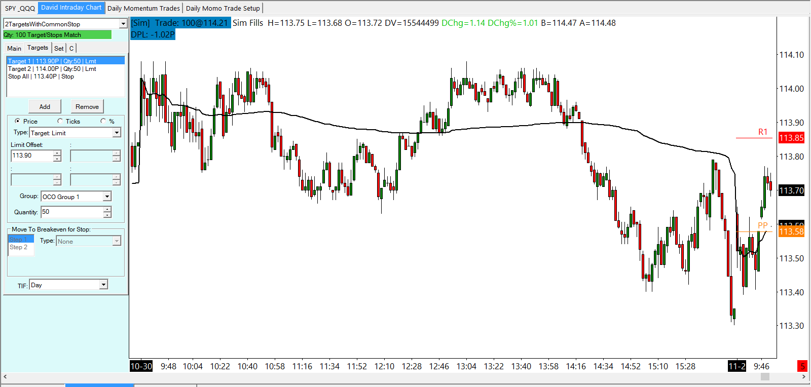 Can you tell me if I can use a set of orders for this type of trade. I've been playing with the sim trading and using the trade window order but it's confusing and doesn't work. I want to attached stop and profit orders after I have entered a stock. I trade only stocks. So say I enter a trade at 50.00 I want to place an initial stop at 49.00. If the price reaches 51.00 I want to sell half my position than move the stop to breakeven at 50.00 If the price reaches 51.95, I want to move my stop to 51.00. and if the price reaches 52.00 I want to exit my final position. This is for a day trading strategy. I want to be able to set my orders and leave the trade to work on it's own. Could you tell me if I'm able to do this. Thanks. |