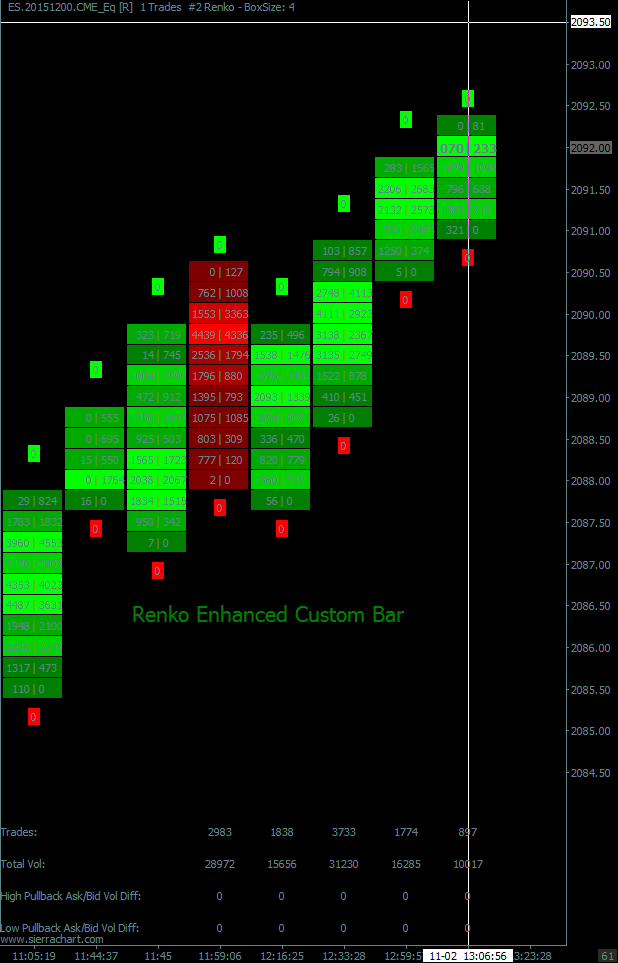 SC Team - Would you please clarify whether the historical pullback data gets populated for custombars? I have used "Renko Enhanced" custom bar(built-in) and noticed the pullback data to be not populated though I have historical pullback column checked in advanced settings. http://www.sierrachart.com/image.php?l=1446491557968.png screencast.com/t/ZXT52Wg8 Background: Trying to build own custom bar - but wanted to make sure it is compatible with number bars and noticed built-in custom bar as well is not populating this data and is the reason for this support request. Any hints? thanks Date Time Of Last Edit: 2015-11-02 19:17:22