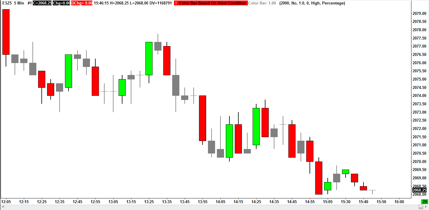 Have you tried the color bar based on study? See the image. If you want, send me an email and I'll send the chartbook to you. Code: ABS(O-C)<(H-L)*.5 -Patrick Zielbauer pz@infinityfutures.com |