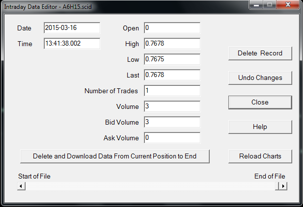 I've decided to verify Tick data for consistency: downloaded tick data using SC Historical Data service and tested it with my own program. Results of verification has raised problem: a lot of records has inconsistent fields. For example lets take a look at A6H15 symbol: Total records: 2993057 137891 records has contradiction between price and Bid/Ask volume fields like: TradePrice=AskPrice (High) but AskVolume=0 and BidVolume=TradeVolume or TradePrice=BidPrice (Low) but BidVolume=0 and AskVolume=TradeVolume so fields in these records shows quite opposite pictures of market order side. In this particular example 4.6% of all records (some other symbols had even 7%) doesnt allow to determine market order side (buy or sell), which means I cant rely on this data if market trade direction is important for me, can I? Could you please clarify which way I need to interpret data in such record to have exact trade direction as it was provided by your datafeed? 1) Ignore position of TradePrice (Close) relative to Ask/Bid prices and take into account only which field (AskVolume, BidVolume) is equal to TotalVolume. 2) Ignore AskVolume, BidVolume and take into account only to which price (High, Low) corresponds TradePrice (Close). 3) There is no way to determine true historical direction of trade 4) other... to make it easier to see what I mean I'll provide screenshot of last such record: as you can see on the picture, BidVolume=3 (means Market Sell), while TradePrice=AskPrice (Close=High) (means Market Buy) this record is seventh from the end. |