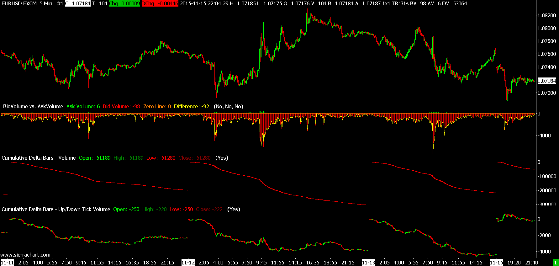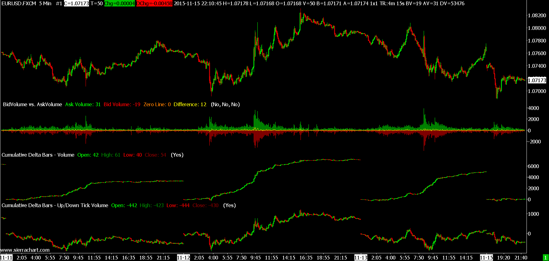 There are no problems. There only exists a misunderstanding. We will help to clarify that.Here is the Cumulative Delta Bar graphs from the FXCM data provided from Sierra Chart: http://www.sierrachart.com/image.php?l=1447643577419.png Sierra Chart Support - Engineering Level Your definitive source for support. Other responses are from users. Try to keep your questions brief and to the point. Be aware of support policy: https://www.sierrachart.com/index.php?l=PostingInformation.php#GeneralInformation For the most reliable, advanced, and zero cost futures order routing, *change* to the Teton service: Sierra Chart Teton Futures Order Routing Date Time Of Last Edit: 2015-11-16 03:18:30