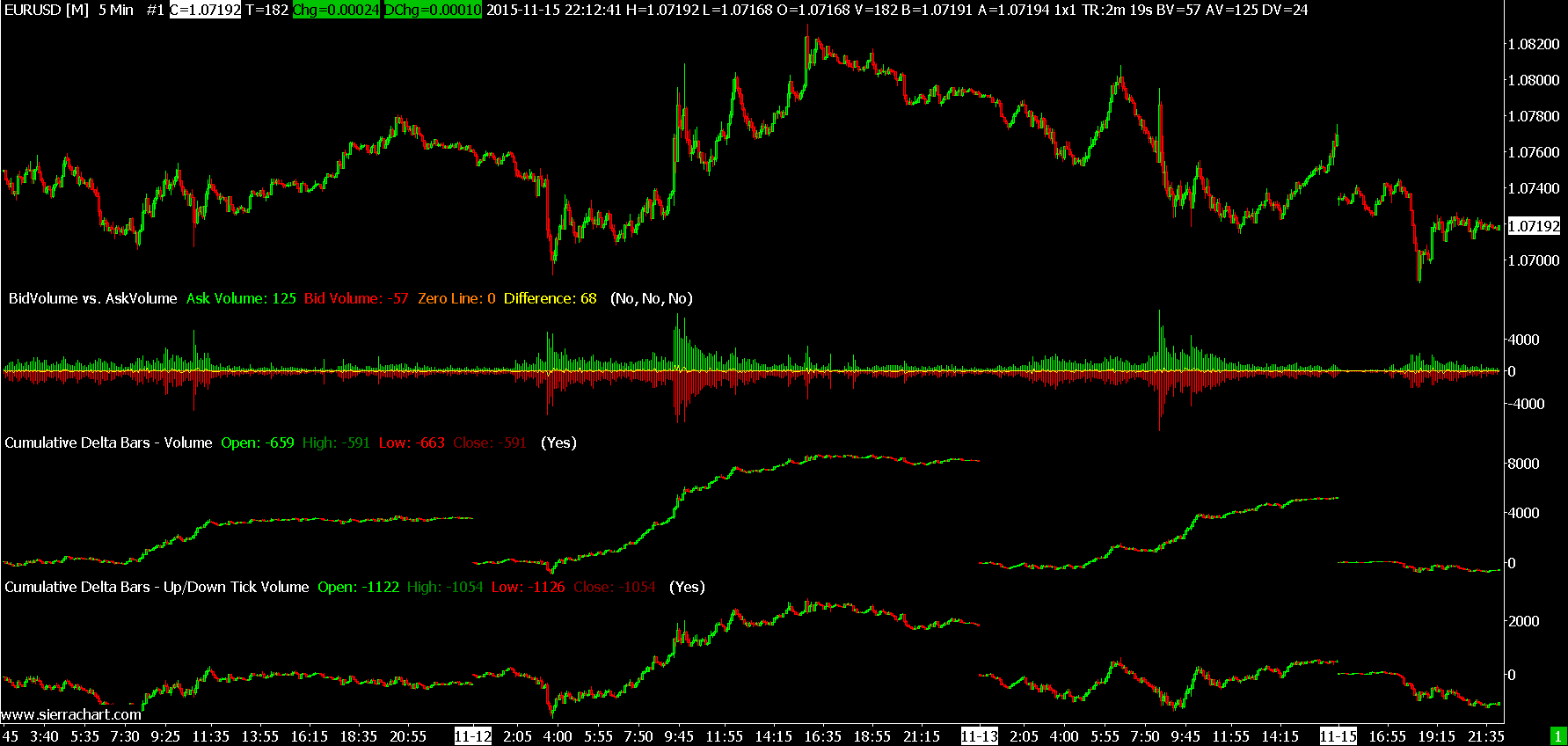 One thing about the Chart images we have provided, the data has been downloaded in 1 tick units. The documentation for that is here: Tick by Tick Data Configuration It needs to be otherwise the Cumulative Delta Bars - Up/Down Tick Volume will not be accurate: https://www.sierrachart.com/index.php?page=doc/doc_TechnicalStudiesReference.html#s323 When you look at the time scale on the images we have posted, you will see the Month-Day so that the dates can be determined. The year is 2015. The time zone is US Eastern time. Sierra Chart Support - Engineering Level Your definitive source for support. Other responses are from users. Try to keep your questions brief and to the point. Be aware of support policy: https://www.sierrachart.com/index.php?l=PostingInformation.php#GeneralInformation For the most reliable, advanced, and zero cost futures order routing, *change* to the Teton service: Sierra Chart Teton Futures Order Routing Date Time Of Last Edit: 2015-11-16 17:32:38