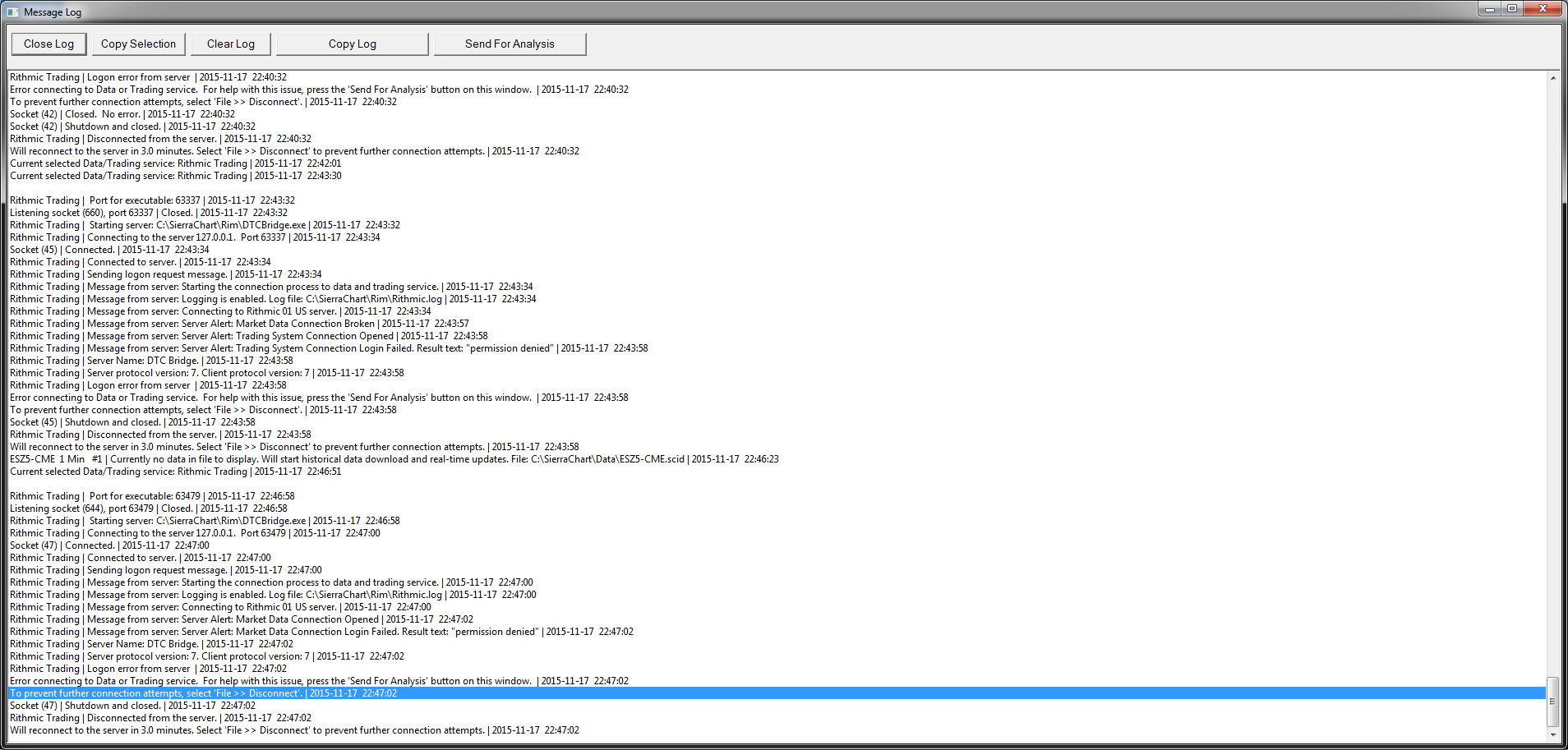 You are getting the Rithmic Permission Denied Error. Please refer to step 17 here: http://www.sierrachart.com/index.php?page=doc/Rithmic.php#SetupInstructions Sierra Chart Support Date Time Of Last Edit: 2015-11-18 20:04:38