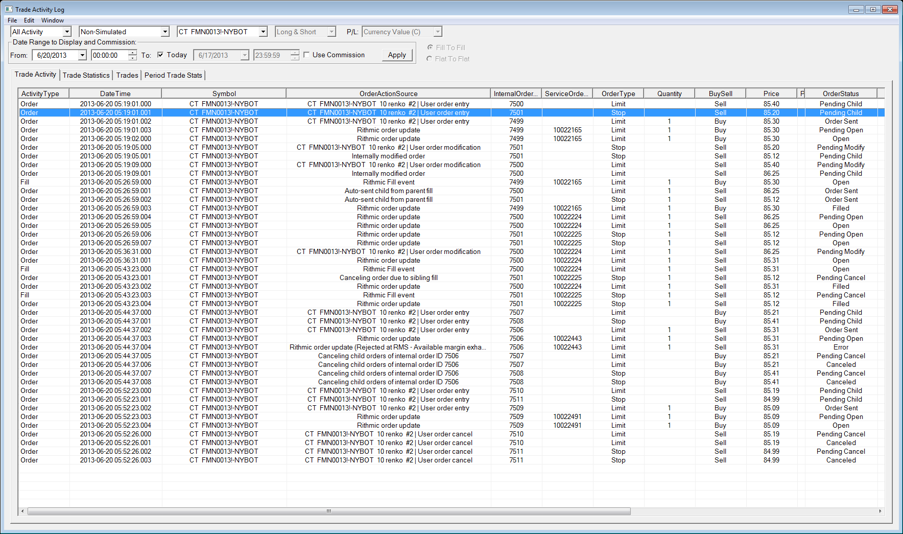I was trading Cotton July futures this morning. I was trading off the chart and using OCO orders. I bought at 85.31 and put my OCO stop at 85.12 (order 7501) and my limit at 85.4 (order 7500). Then I realized that July is not the active contract and moved my limit price down to 85.31 (7500) to exit the position. The bid/ask were near 85.3 but not quite there. I then clicked on chart->"Perform futures symbol rollover" and the chart rolled over to october. The contract with the highest volume was december so I rolled it over again. Then both orders seemed to execute. Time / Action 05:43:23.000 - Sell at 85.31 filled (order 7500) 05:43:23.001 - Cancelling order 7501 (stop at 85.12) 05:43:23.002 - rithmic order update 85.31 filled 05:43:23.003 - rithmic fill event, stop at 85.12 filled 05:43:23.004 - rithmic order update, 85.12 filled I attached a screen shot of the trade activity log. |